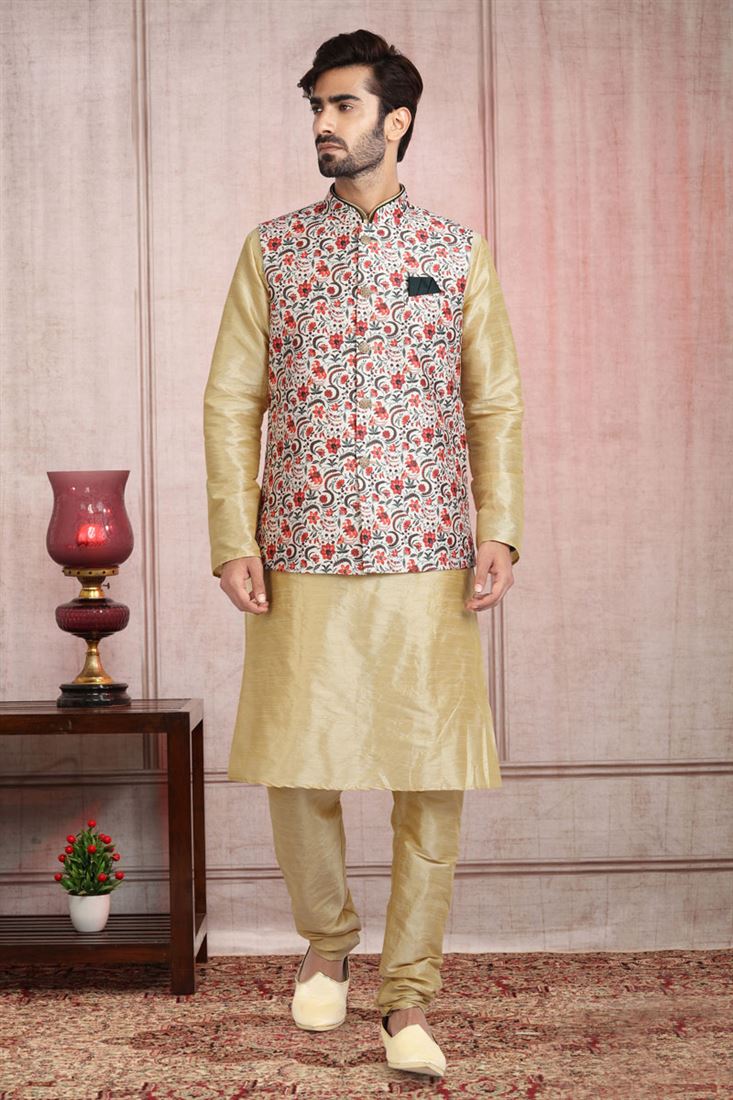 Banarasi Style Art Silk Fabric Beige Color Kurta Pyjama With Jacket