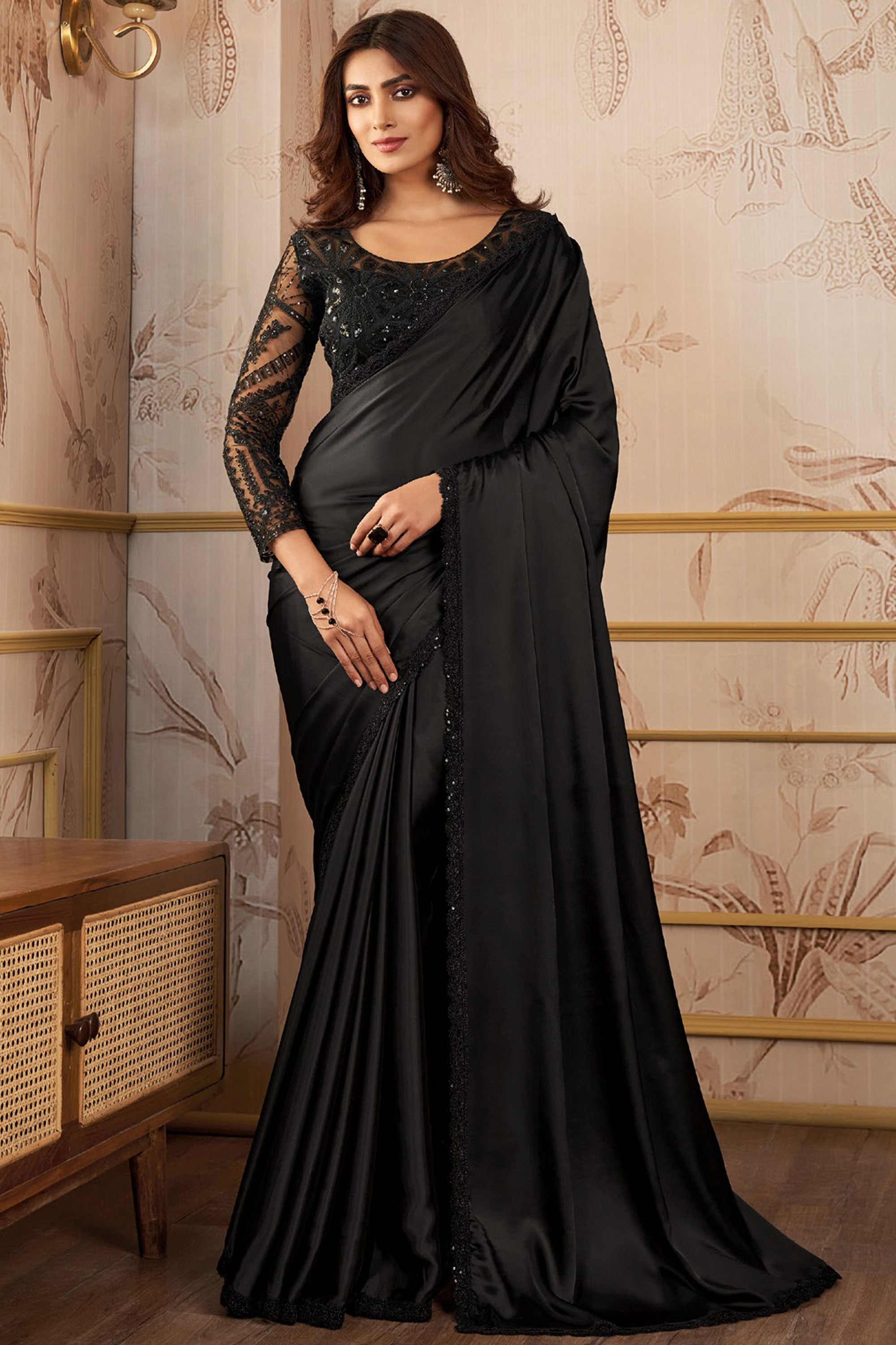 Beautiful Black Color Lace Work Satin Saree With Heavy Embroidered Blouse