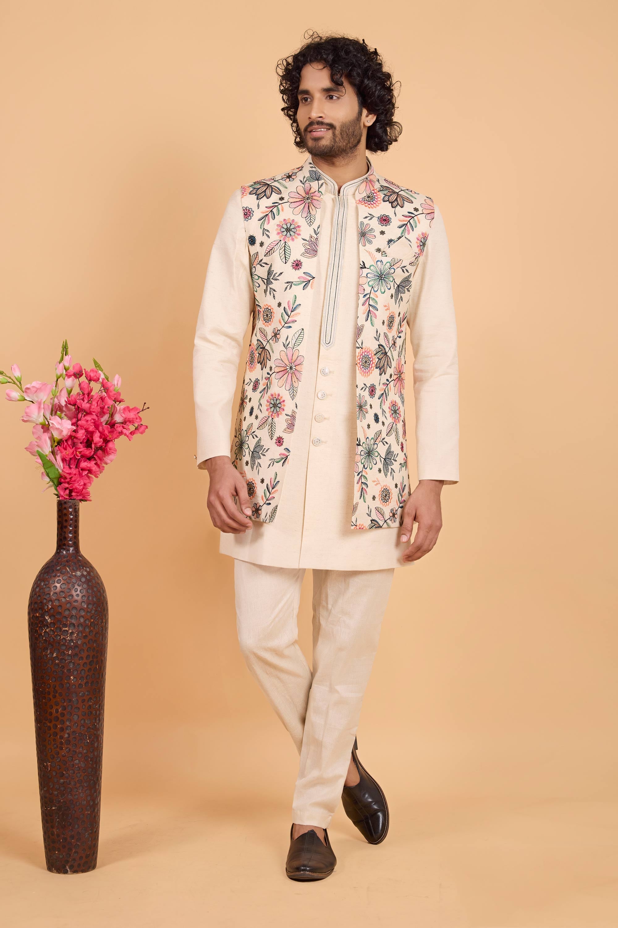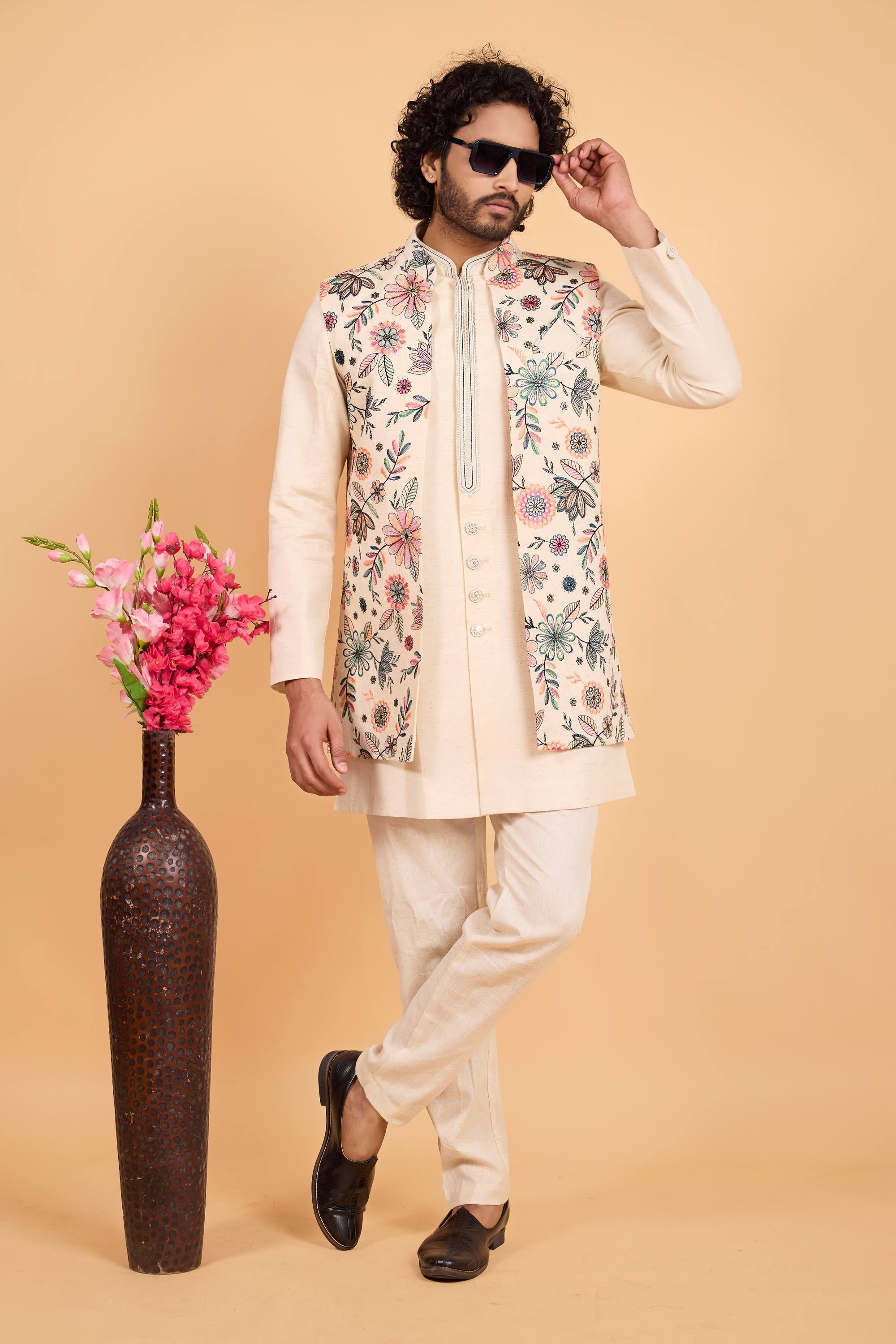 Beautiful Cream Art Silk Wedding Wear Readymade Kurta And Aligadhi Pant With Embroidered Jacket Men