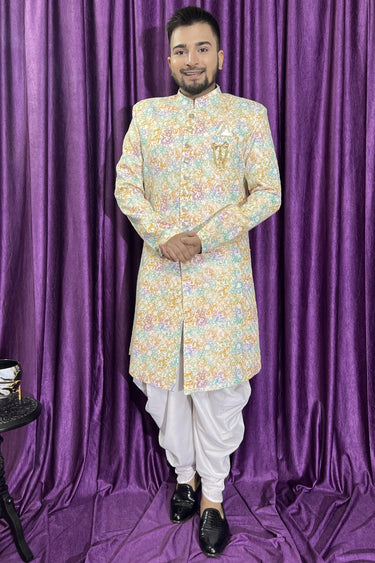 The Reach Color Wedding Wear Designer Readymade Peshawari Style Indo Western For Men is an excellent choice for men looking to add a traditional touch to their modern wardrobe. This outfit is perfect for wedding ceremonies, engagements, and other formal events. It features a beautifully crafted kurta with detailed embroidery on the collar and sleeves, and breeches that add an ethnic touch. The Indo Western outfit is made from high-quality materials, ensuring that it lasts for years. It has a slim-fit design that provides a comfortable yet sleek look. Accessorize this outfit with a pair of matching jutti and a turban for an overall sophisticated look.