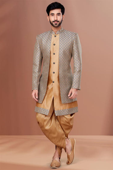 Beautiful Dark Beige Color Wedding Wear Readymade Dhoti Style Indo Western For Men In Jacquard Fabric