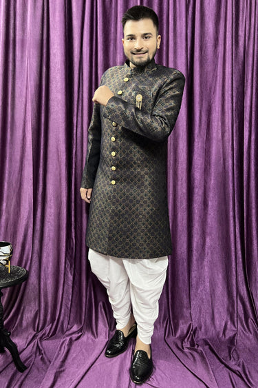 Beautiful Dark Green Color Wedding Wear Readymade Peshawari Style Indo Western For Men In Jacquard Fabric