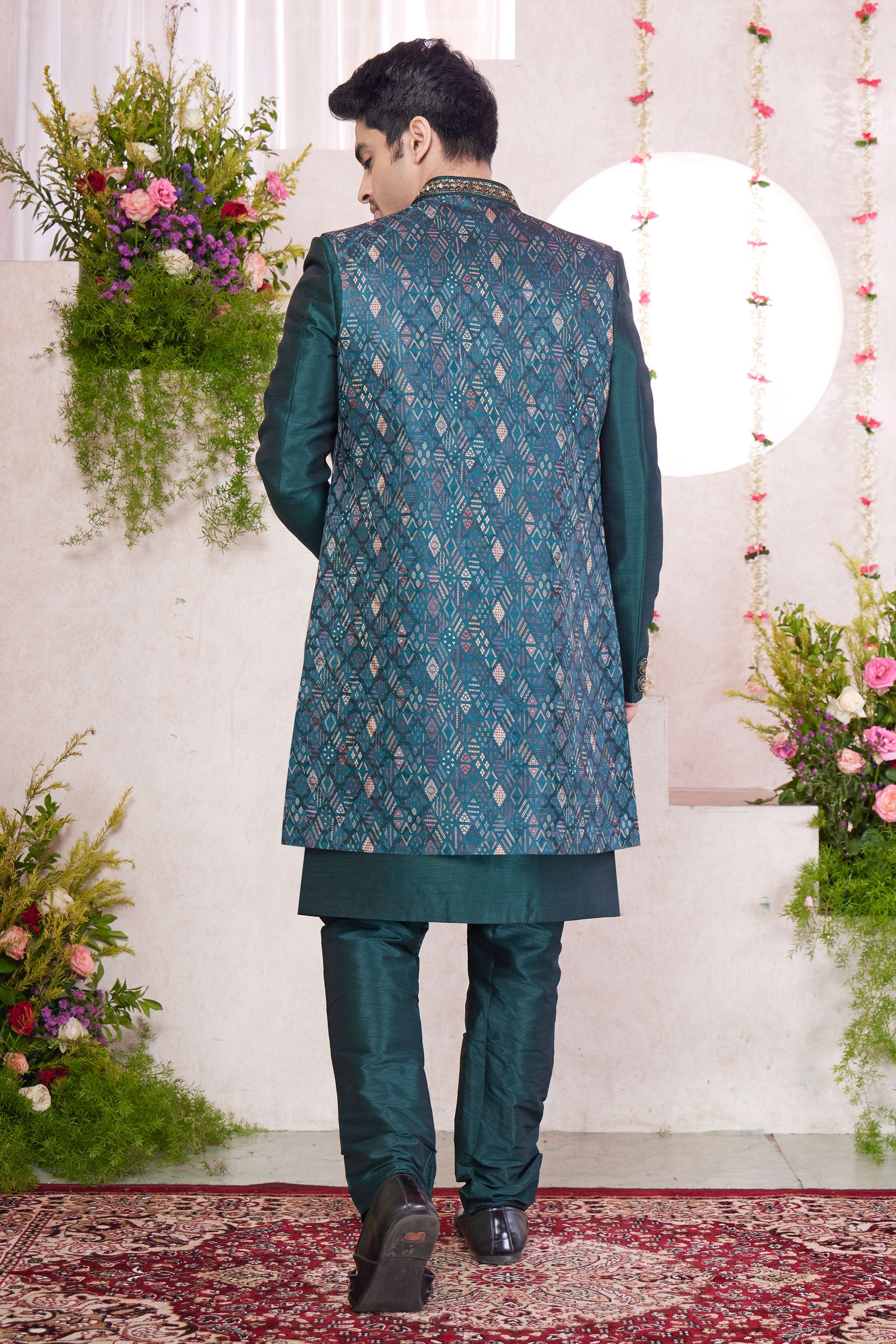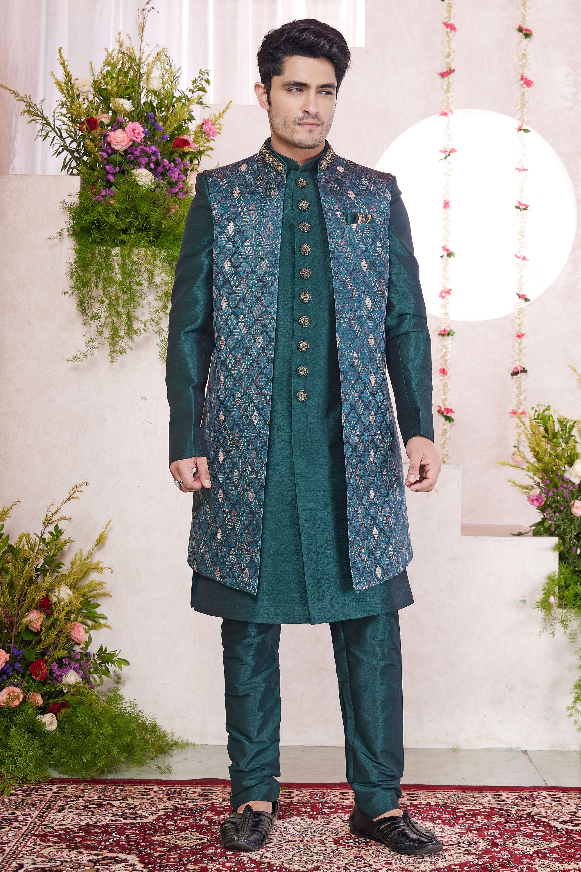 Beautiful Green Wedding Wear Readymade Indo Western For Men In Jacquard Art Silk Fabric