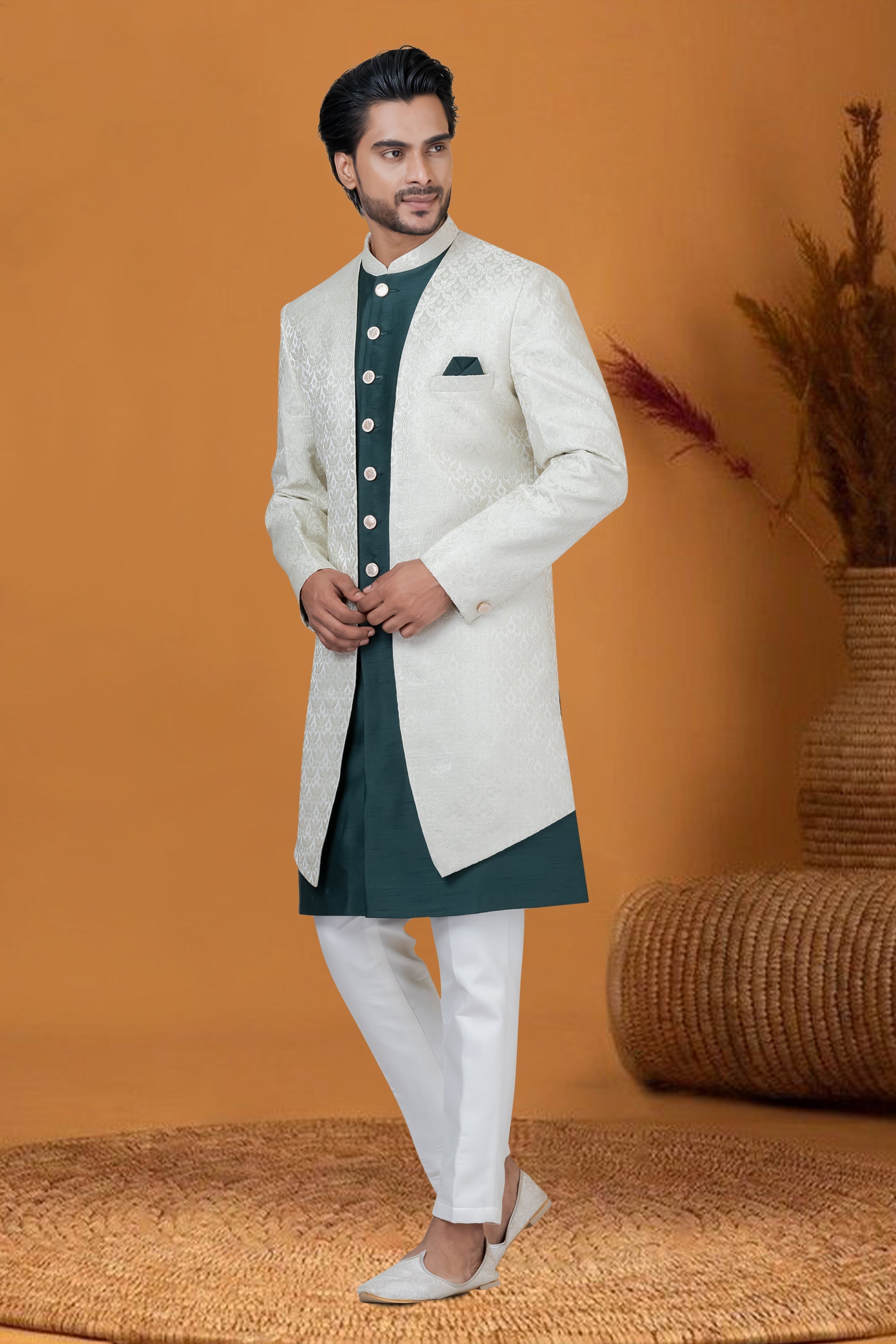 Beautiful Jacquard Work Off White Color Wedding Wear Readymade Indo Western For Men In Jacquard Silk Fabric
