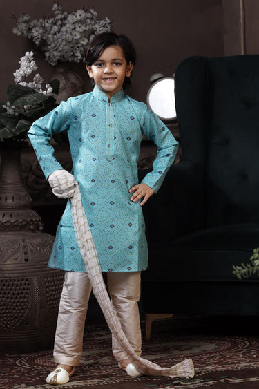 Beautiful Light Cyan Color Cotton Fabric Printed Reception Wear Readymade Boys Kurta Pyjama