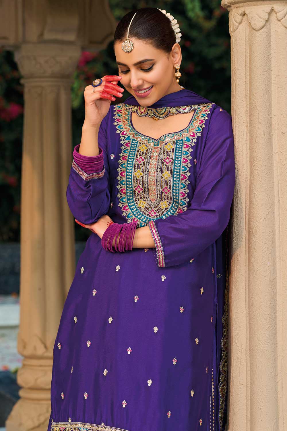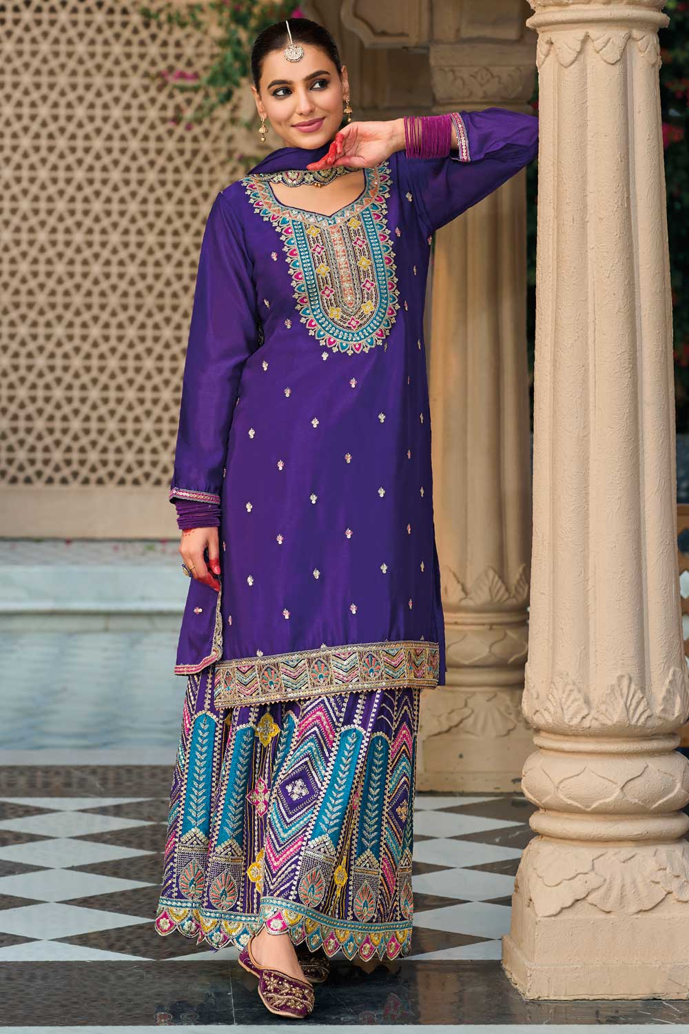 Beautiful Purple Color Readymade Palazzo Suit In Chinon Fabric