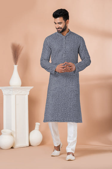 Beautiful Sequins Embroidery Georgette Fabric Wedding Wear Readymade Kurta Pyjama For Men In Grey Color
