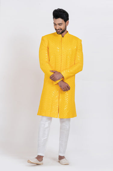 Beautiful Sequins Work Yellow Color Wedding Wear Readymade Indo Western For Men In Viscose Fabric