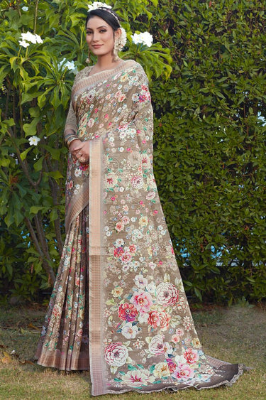 Beguiling Chikoo Color Cotton Silk Fabric Festive Look Saree