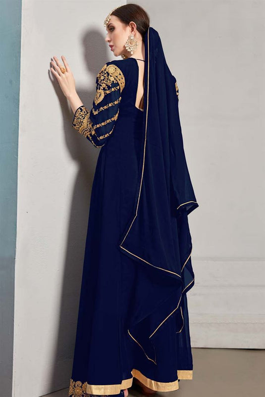 Beguiling Embroidered Work On Navy Blue Color Georgette Fabric Sangeet Wear Anarkali Suit