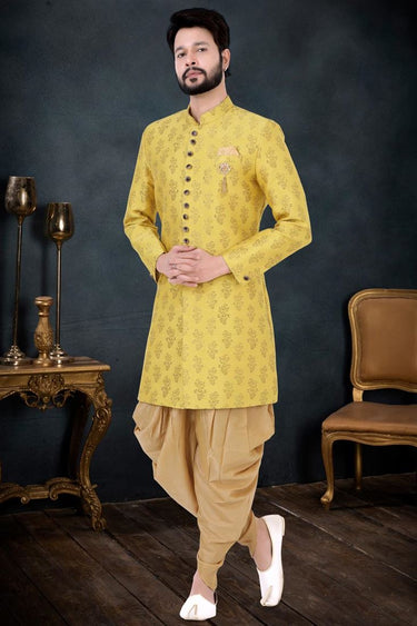 Beguiling Yellow Color Jacquard Fabric Indo Western