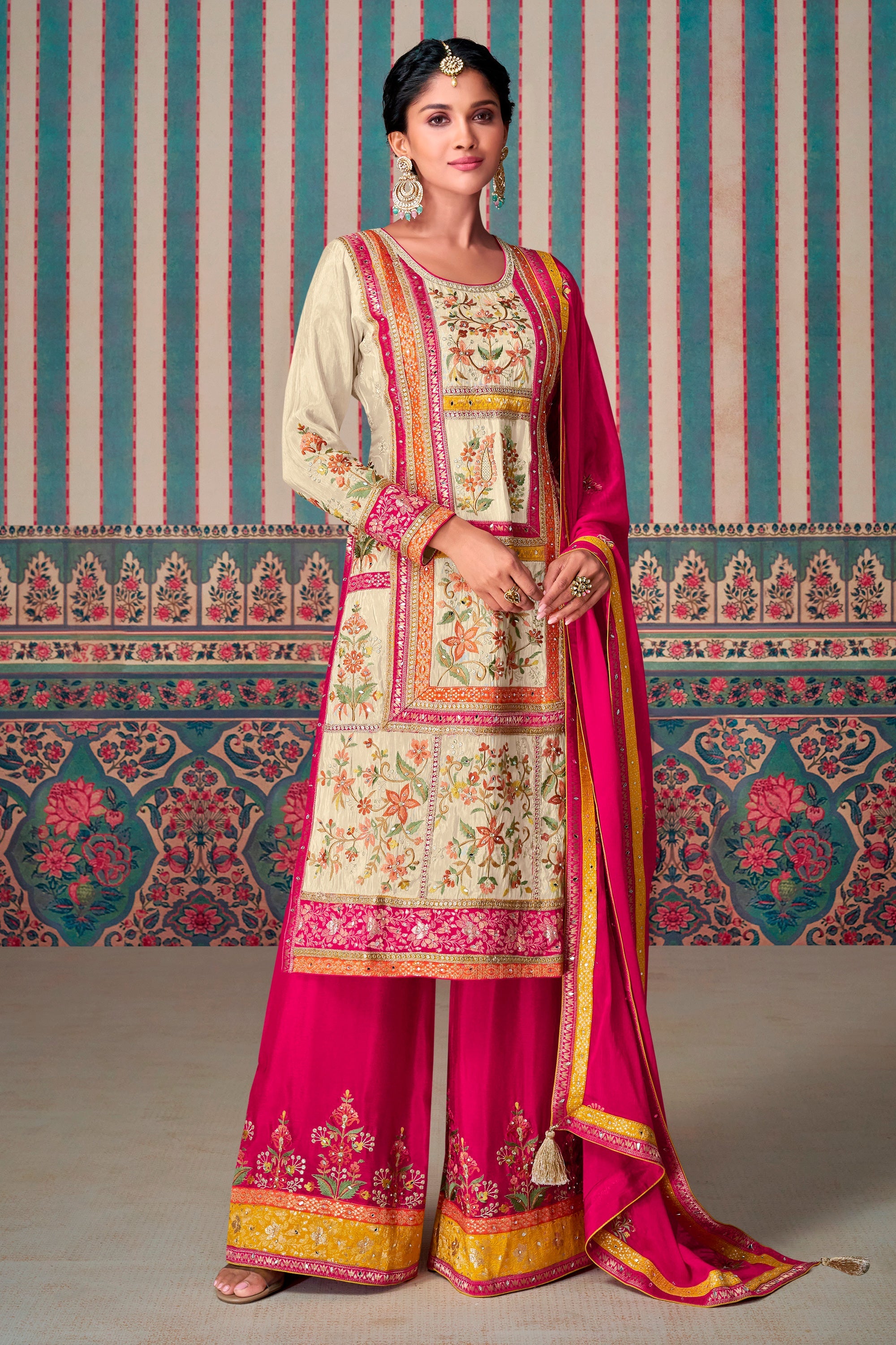 Add a splash of vibrant color to your wardrobe with the Chinon Reach Color Palazzo Suit With Dupatta. Made from premium Chinon fabric, this outfit features a lovely color scheme that is both eye-catching and stylish. The set comes with a chic palazzo pant, an elegant top, and a coordinating dupatta that ties the look together beautifully. Perfect for festivals, ceremonies, and social events, this suit offers a perfect blend of tradition and modernity. Available in various sizes for the perfect fit, this ensemble will quickly become a favorite in your closet.