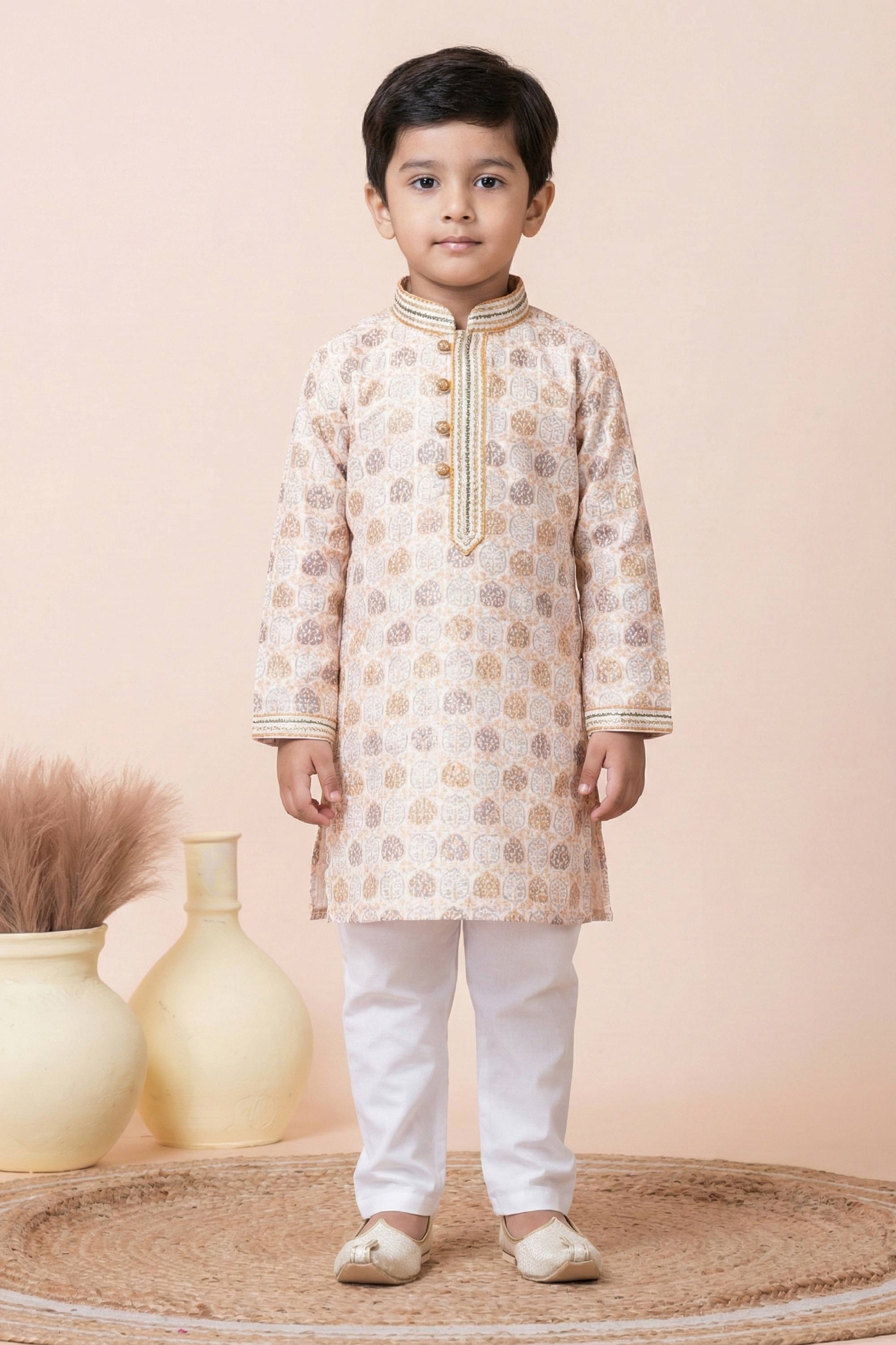 Beige Cotton Fabric Boys Readymade Kurta Pyjama For Festive Wear