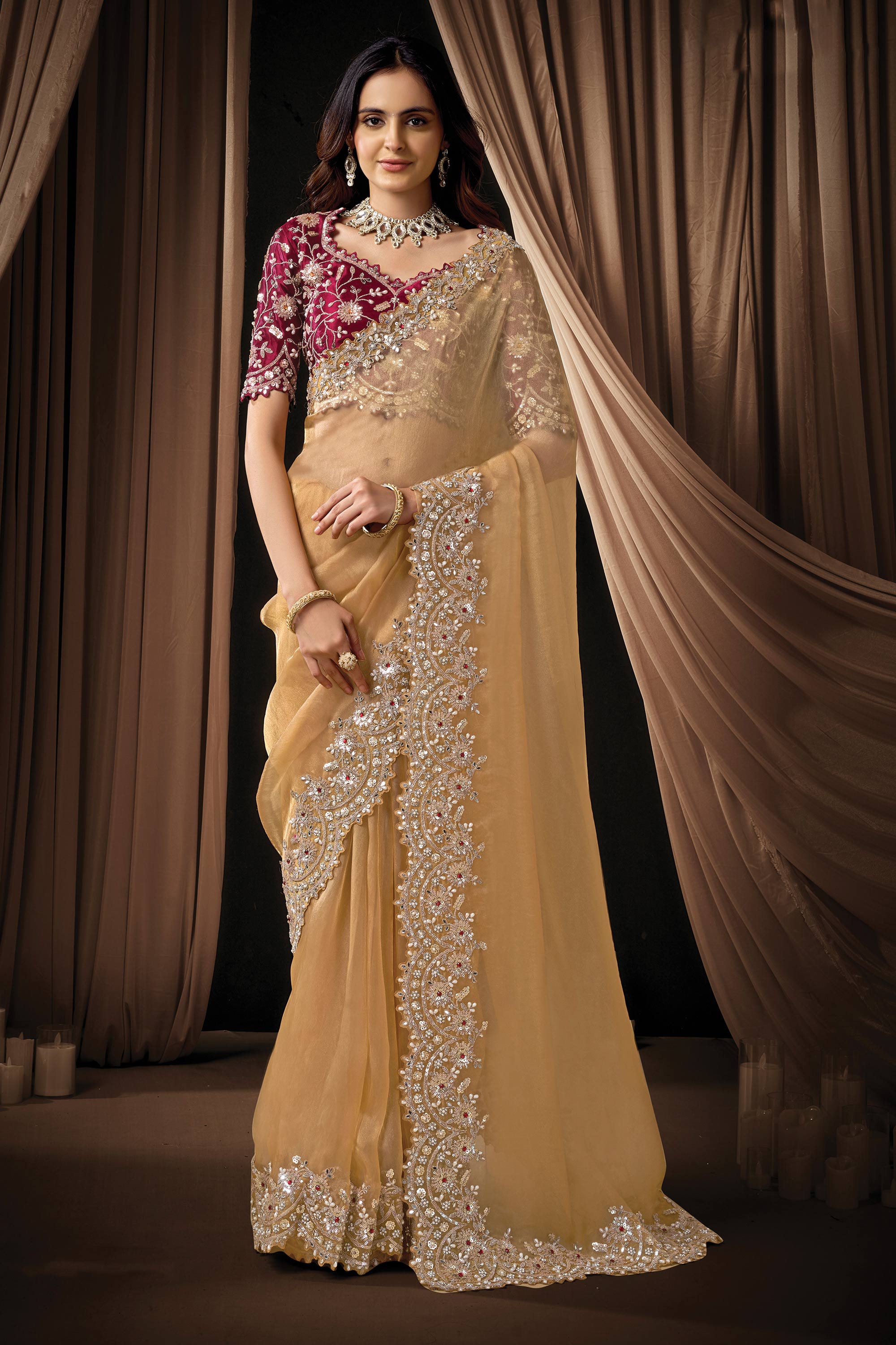 Beige Organza Fabric Embroidered Function Wear Saree