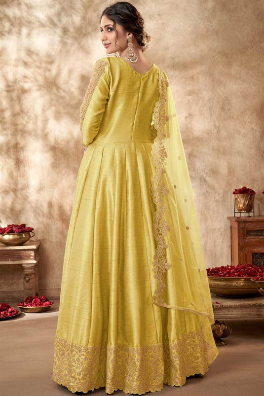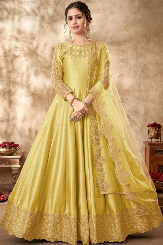 Bewitching Embroidered Work On Art Silk Fabric Anarkali Suit In Yellow Color
