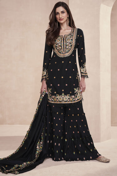 Black Art Silk Fabric Embroidered Festive Wear Readymade Palazzo Salwar Suit