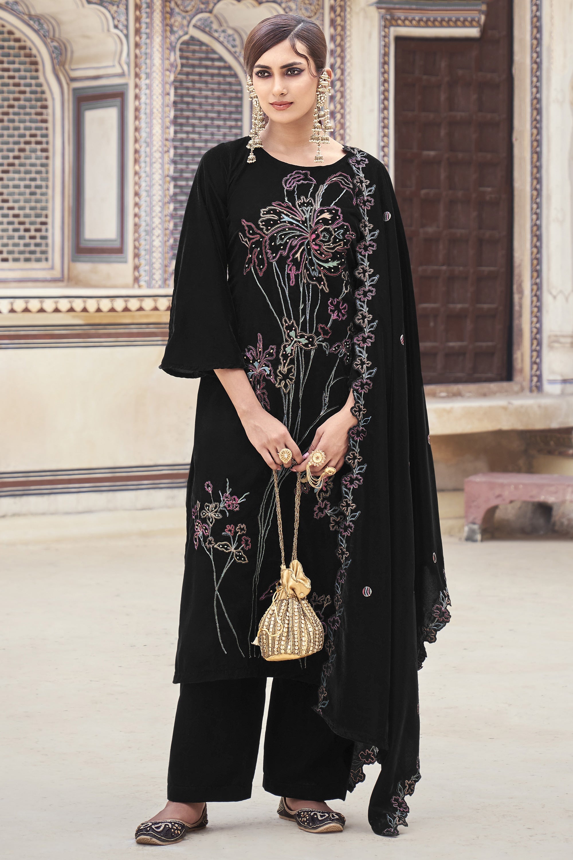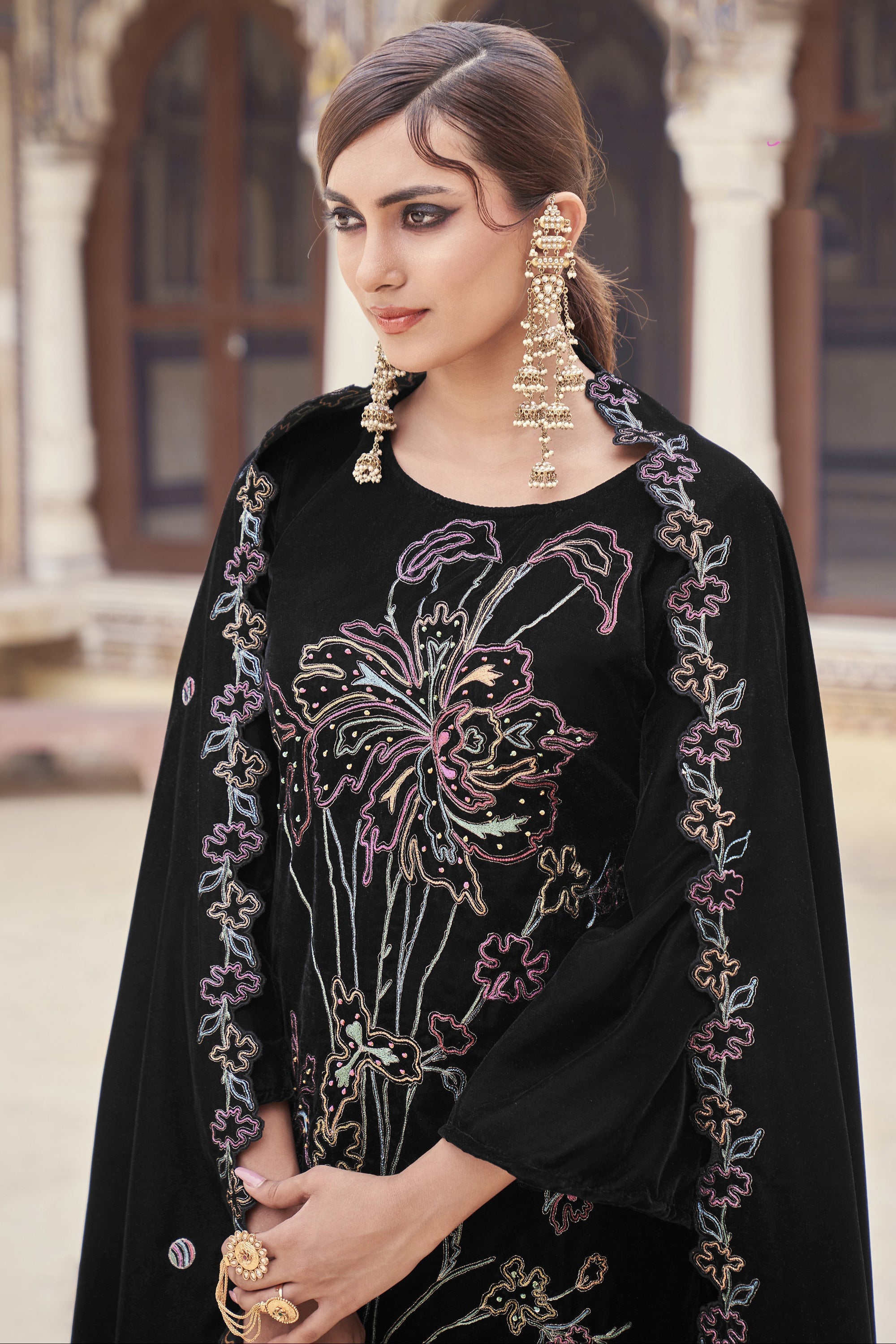 Black Color Function Wear Heavy Embroidered Designer Long Straight Cut Salwar Suit In Velvet Fabric