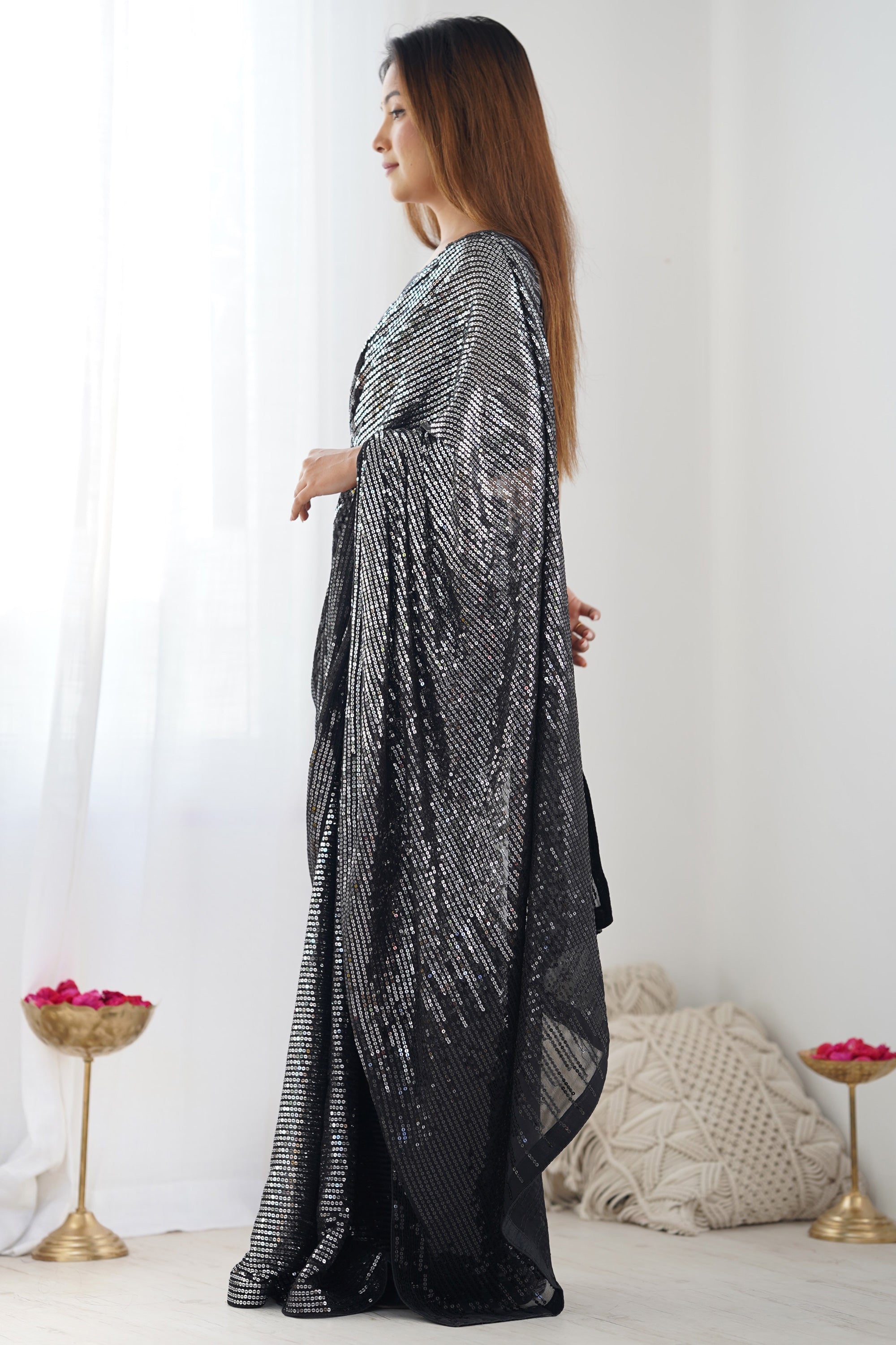 Discover elegance with this black party wear saree, crafted from premium georgette fabric. The saree is accentuated with designer sequance embroidery work, making it perfect for any special occasion. The unstitched blouse made from satin Banglori fabric complements the saree beautifully. Ideal for functions, parties, and weddings, this 5.5 meter saree comes with a 0.80 meter blouse piece. To keep it looking its best, please dry clean only. Please note, slight color variation is possible.