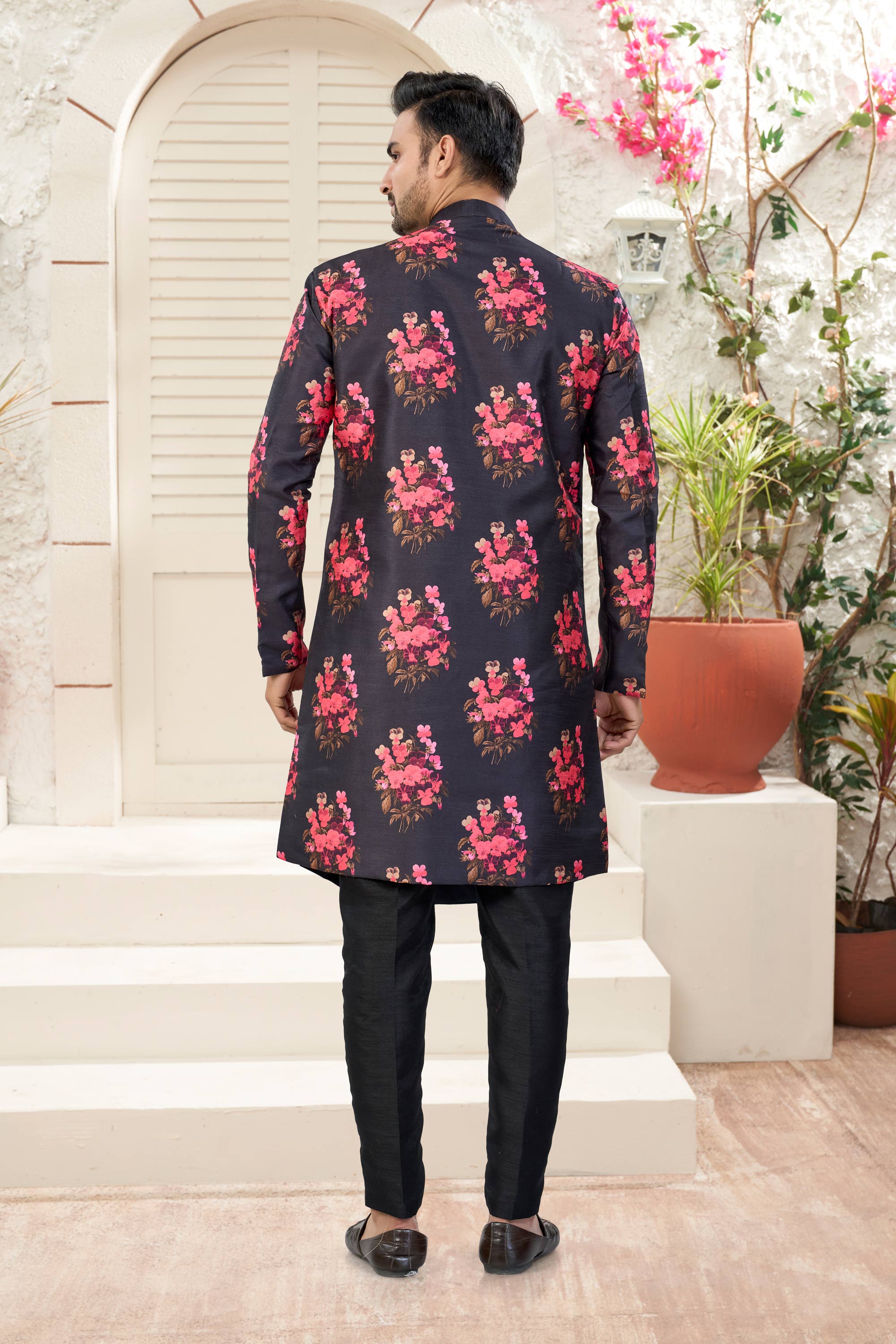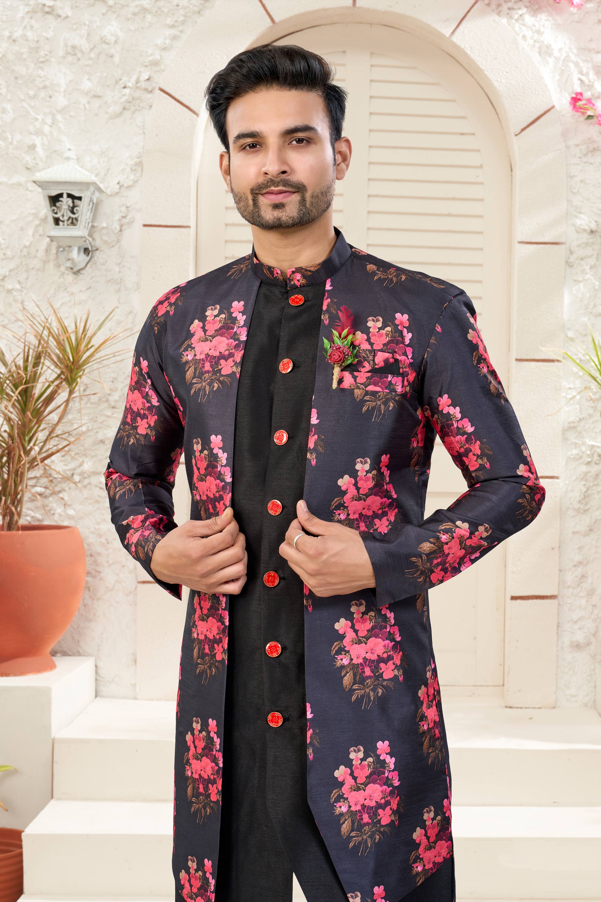 Black Wedding Wear Banarasi Silk Fabric Readymade Indo Western For Men