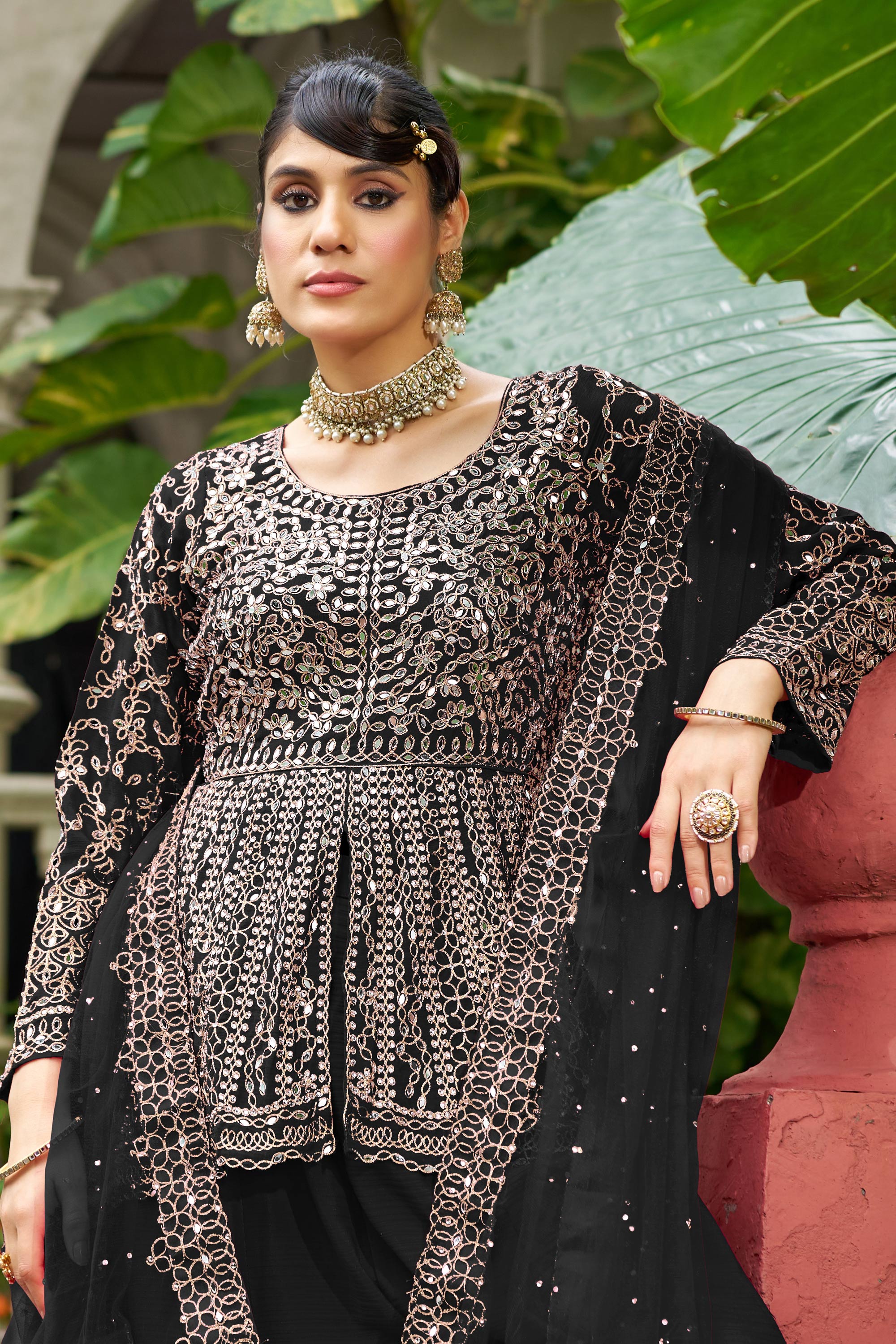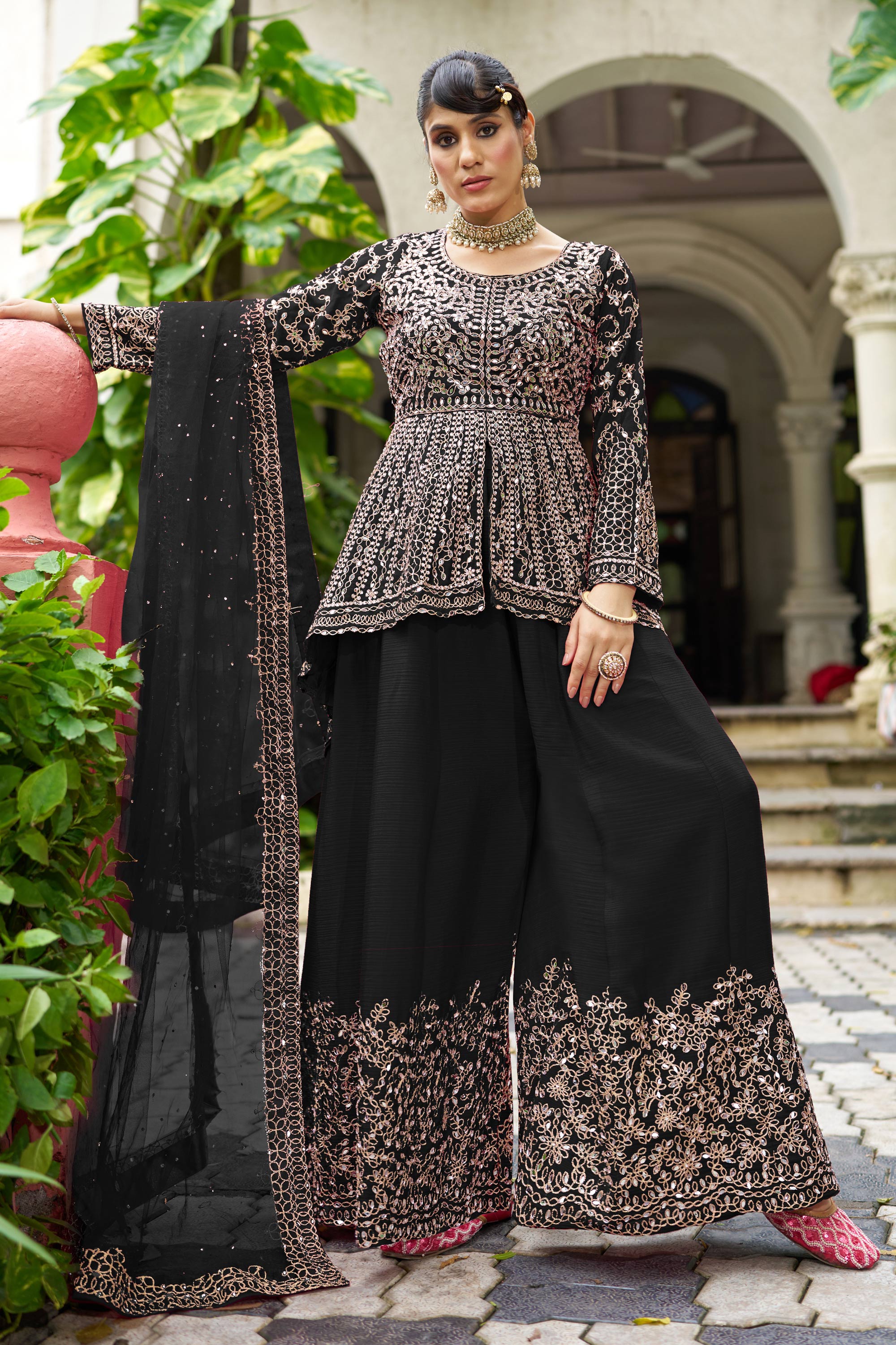 Black Wedding Wear Chinon Embroidered Readymade Palazzo Suit