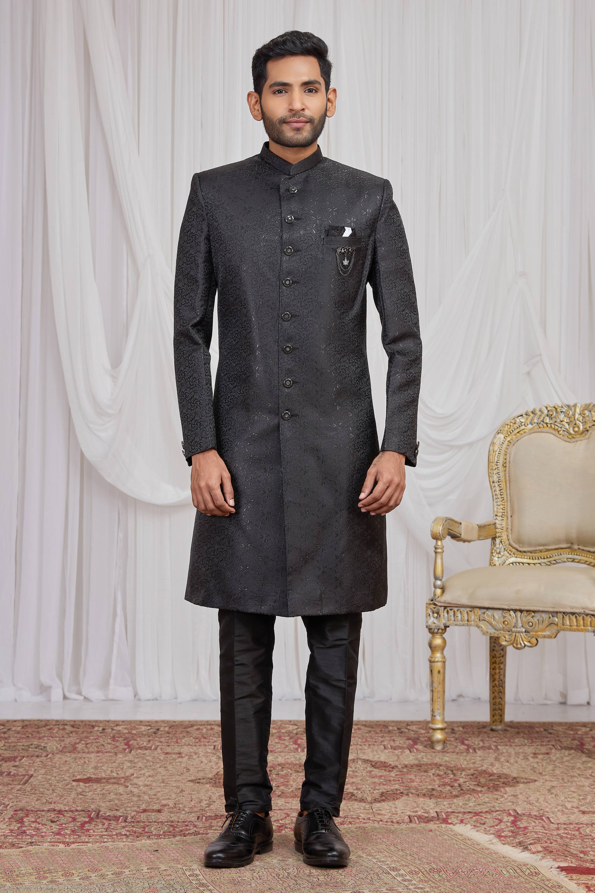 Black Wedding Wear Jacquard Fabric Readymade Indo Western For Men