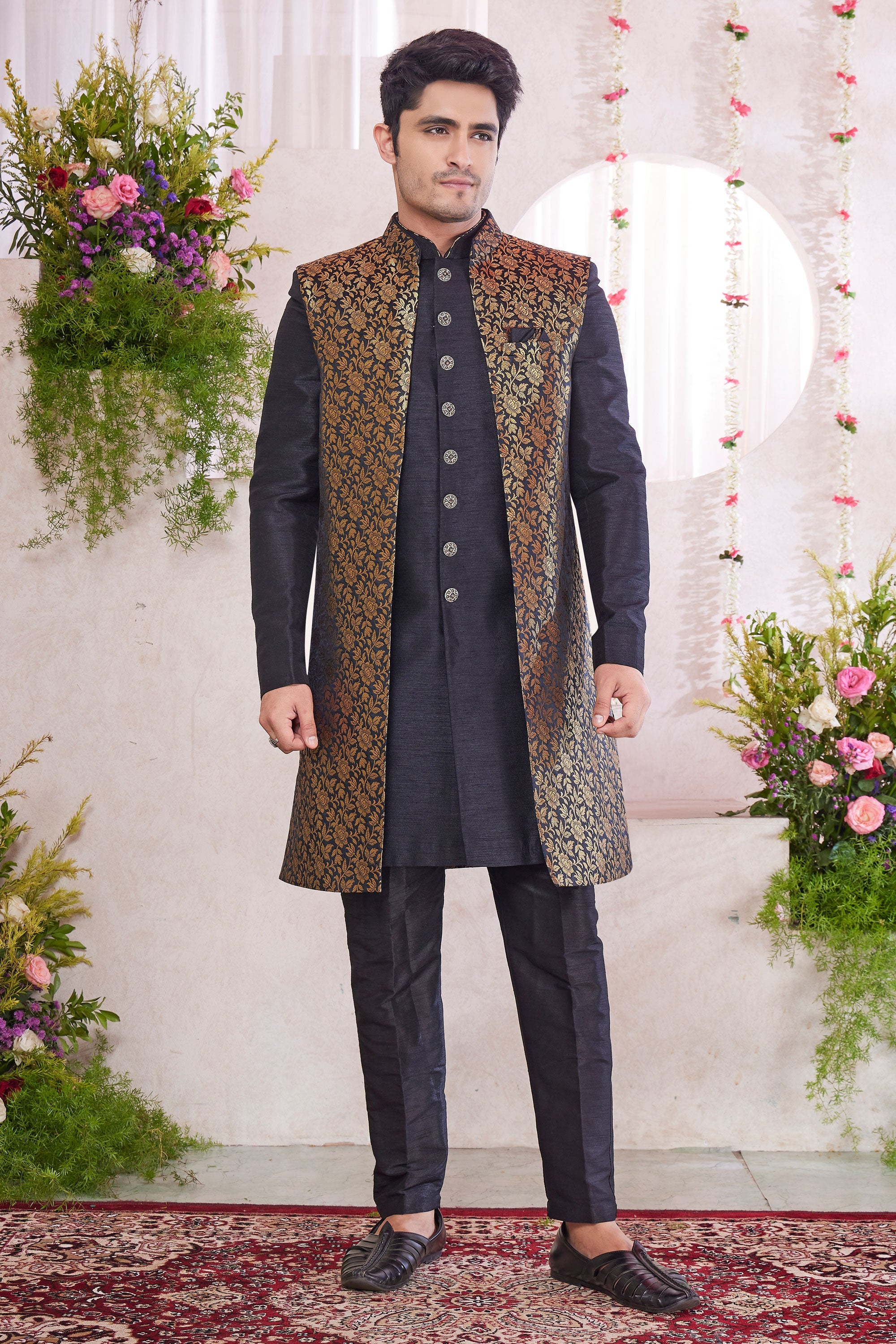 Black Wedding Wear Readymade Glamorous Indo Western For Men In Jacquard Art Silk Fabric