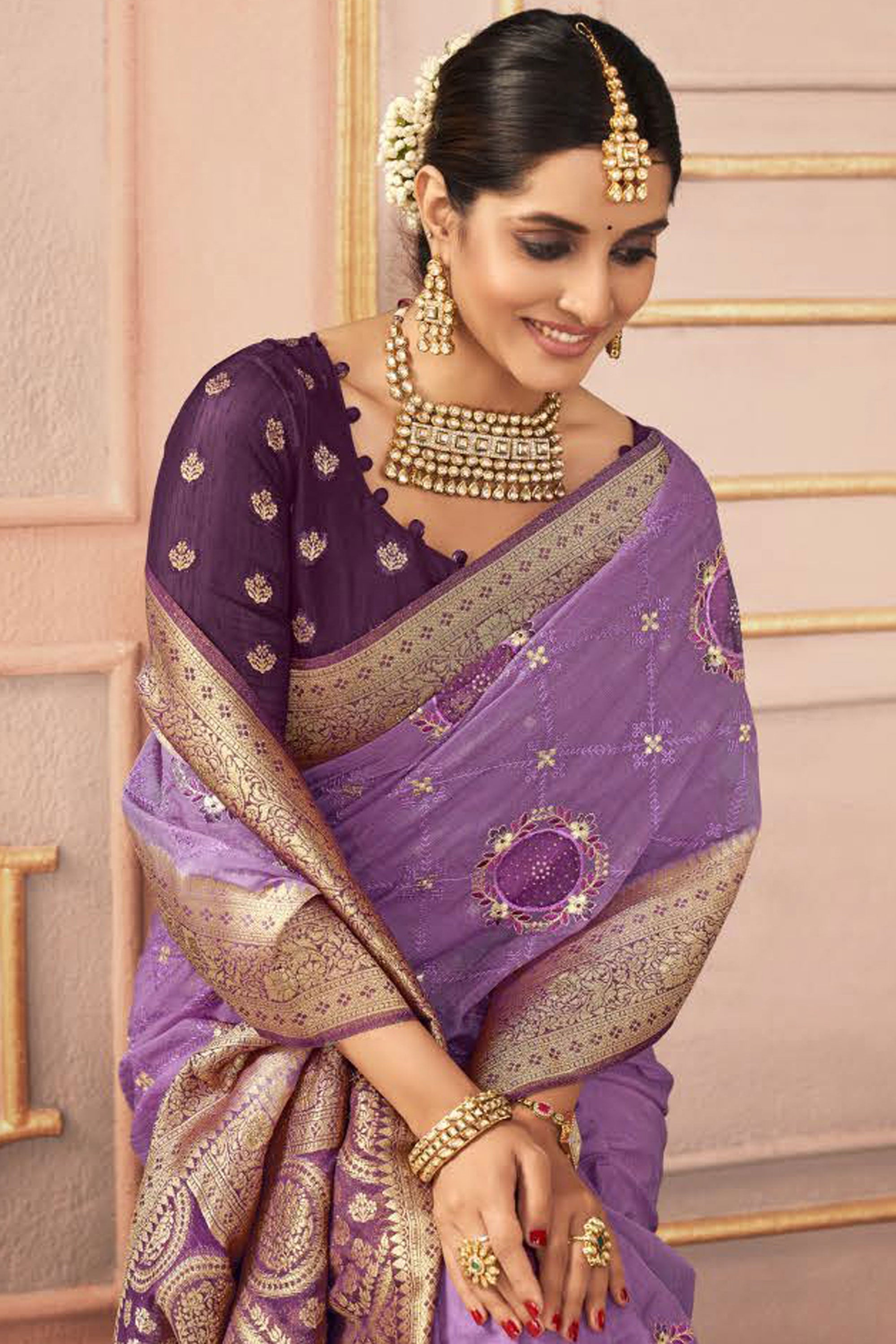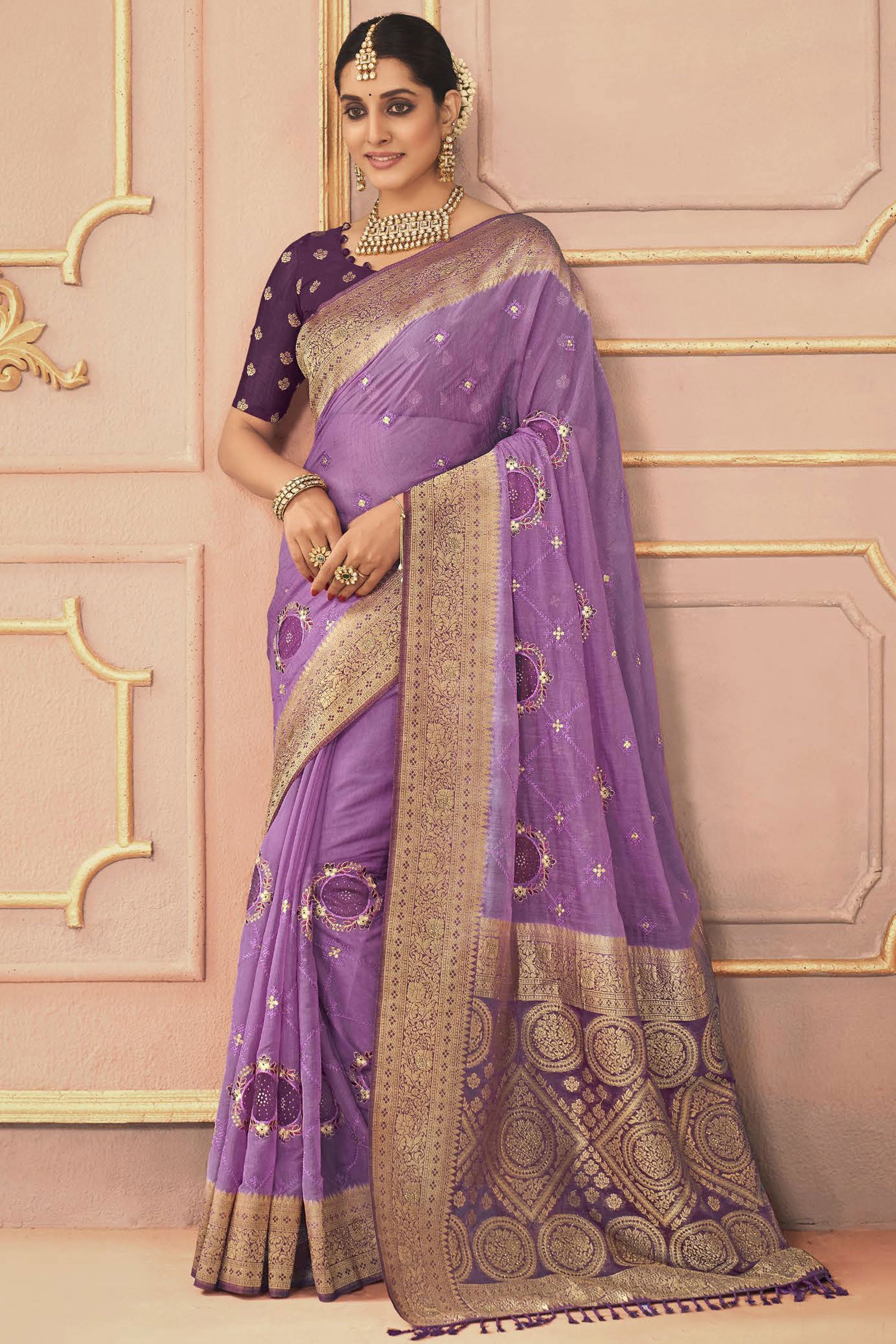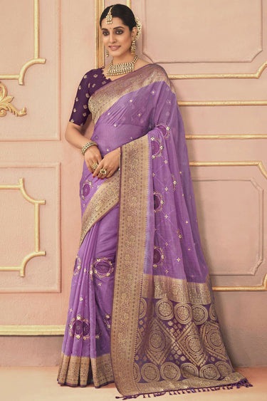 Blazing Lavender Color Embroidered Work Sangeet Function Silk Saree