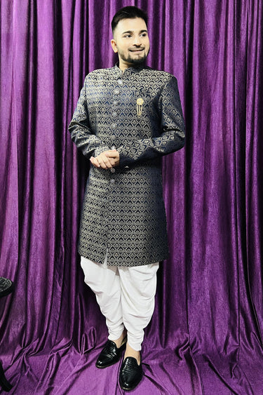 Blue Color Designer Jacquard Fabric Wedding Wear Readymade Peshawari Style Indo Western For Men