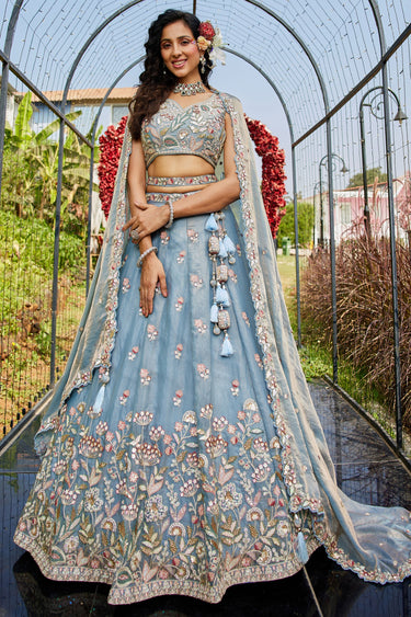 Step into elegance with this designer lehenga choli set, featuring exquisite embroidery. The semi-stitched lehenga offers a customizable waist up to 38 inches and has a stunning 3-meter flair. The lehenga measures 42 inches in length with a 27-inch belt for added support. Paired with a choli adjustable up to 40 inches at the bust, and a dupatta of 2.50 meters length and 1-meter width, this outfit ensures you shine on your special day. Slight color variations may occur due to lighting and screen settings. Ships within 5 to 7 working days. Dry clean only.
