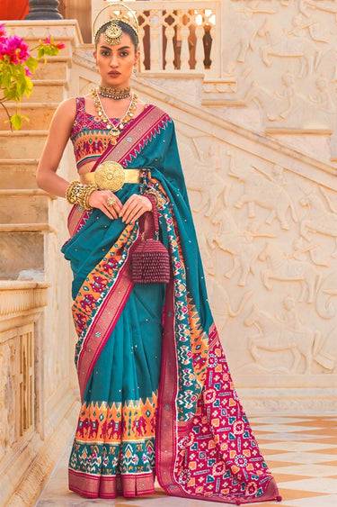 Blue Embroidered Printed Patola Cotton Silk Saree
