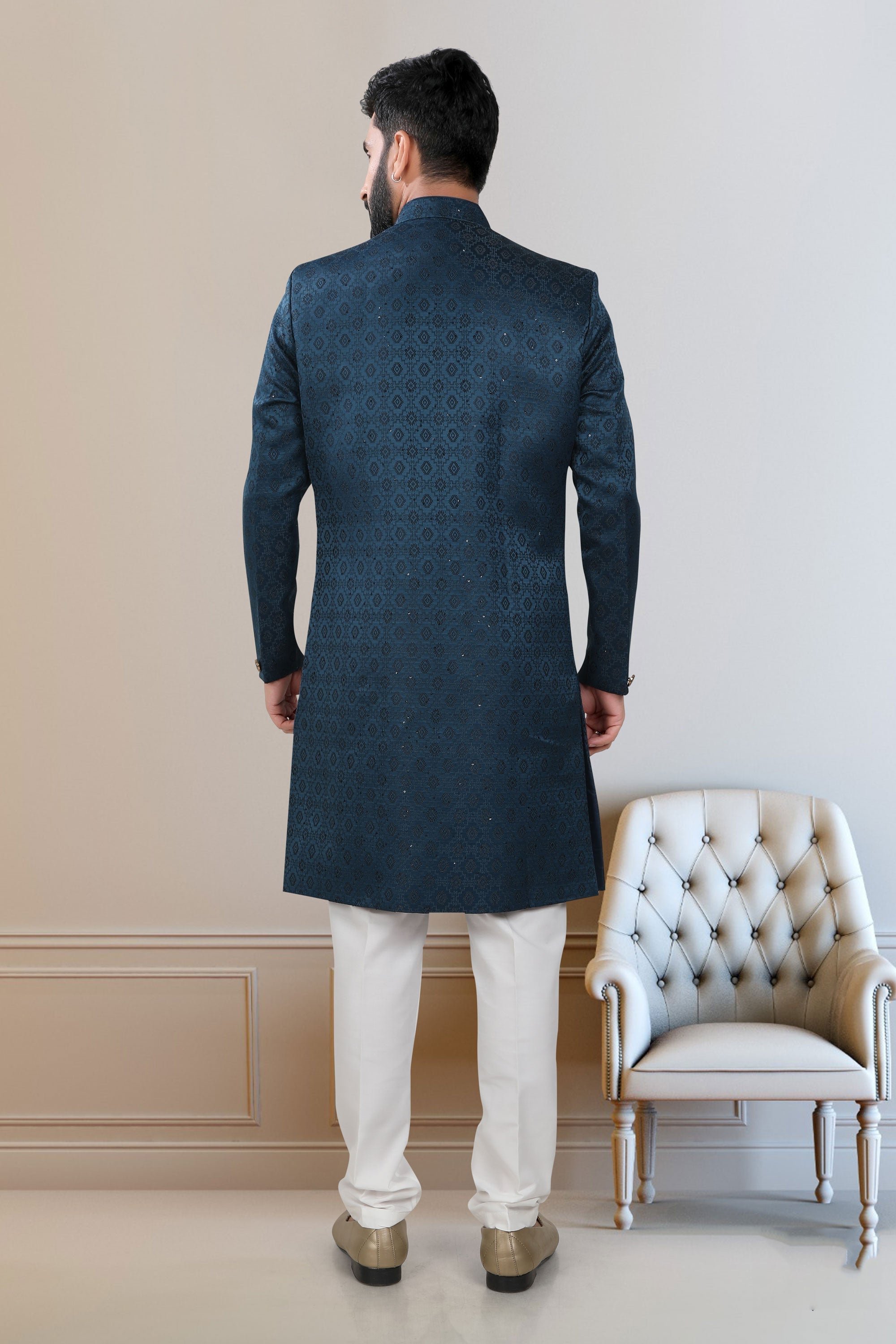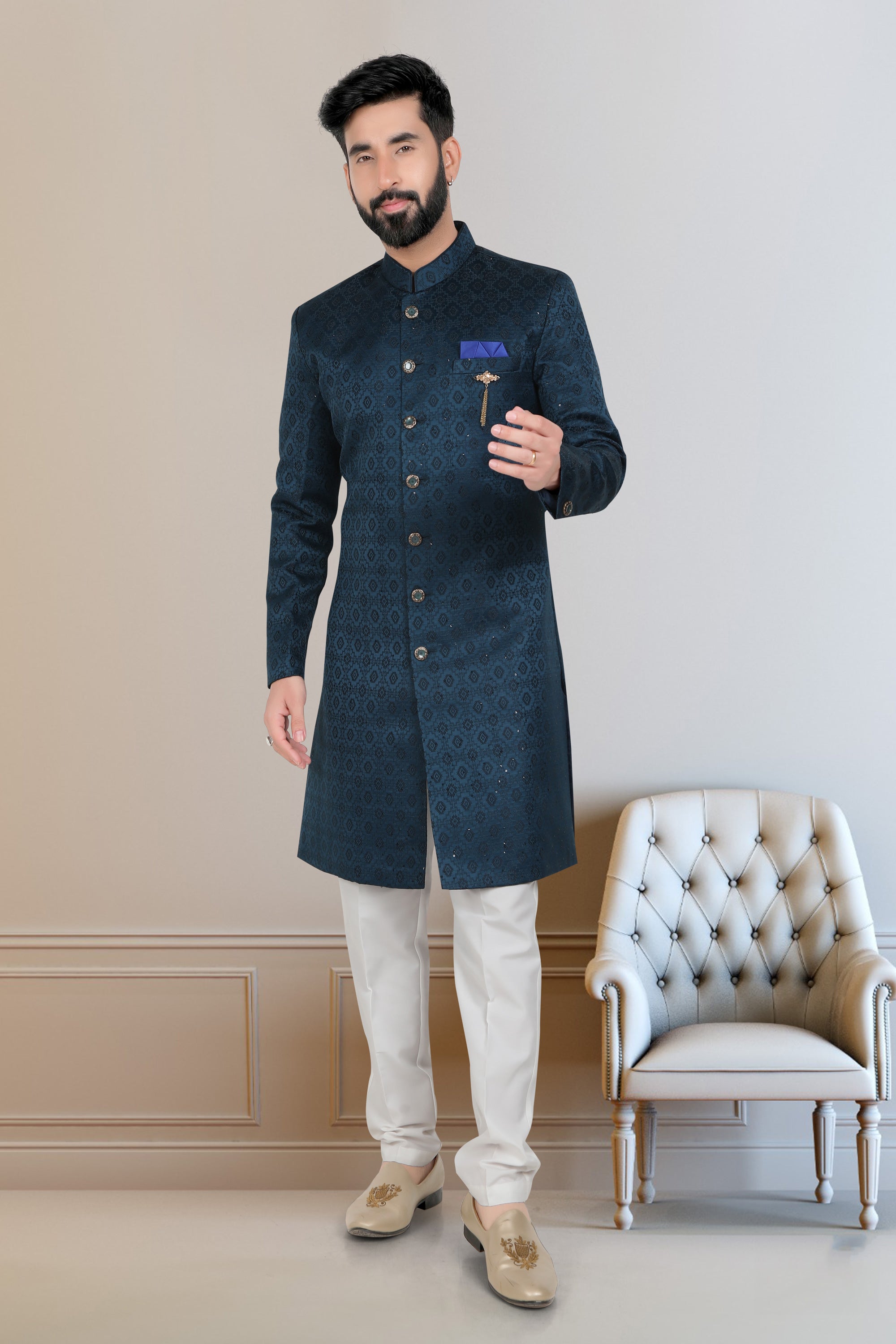 Make a stylish statement at your wedding with this striking Indo Western outfit for men. Designed with attention to detail, this readymade attire combines a luxurious fabric with an appealing color scheme that suits any grand occasion. The fusion design blends traditional elegance with a modern flair, ensuring you stand out in any celebration. Easy to wear and comfortable, it is tailored to perfection, making it the ideal choice for grooms and guests alike. Step into sophistication and charm with this stunning Indo Western piece, crafted to leave a lasting impression on your special day.