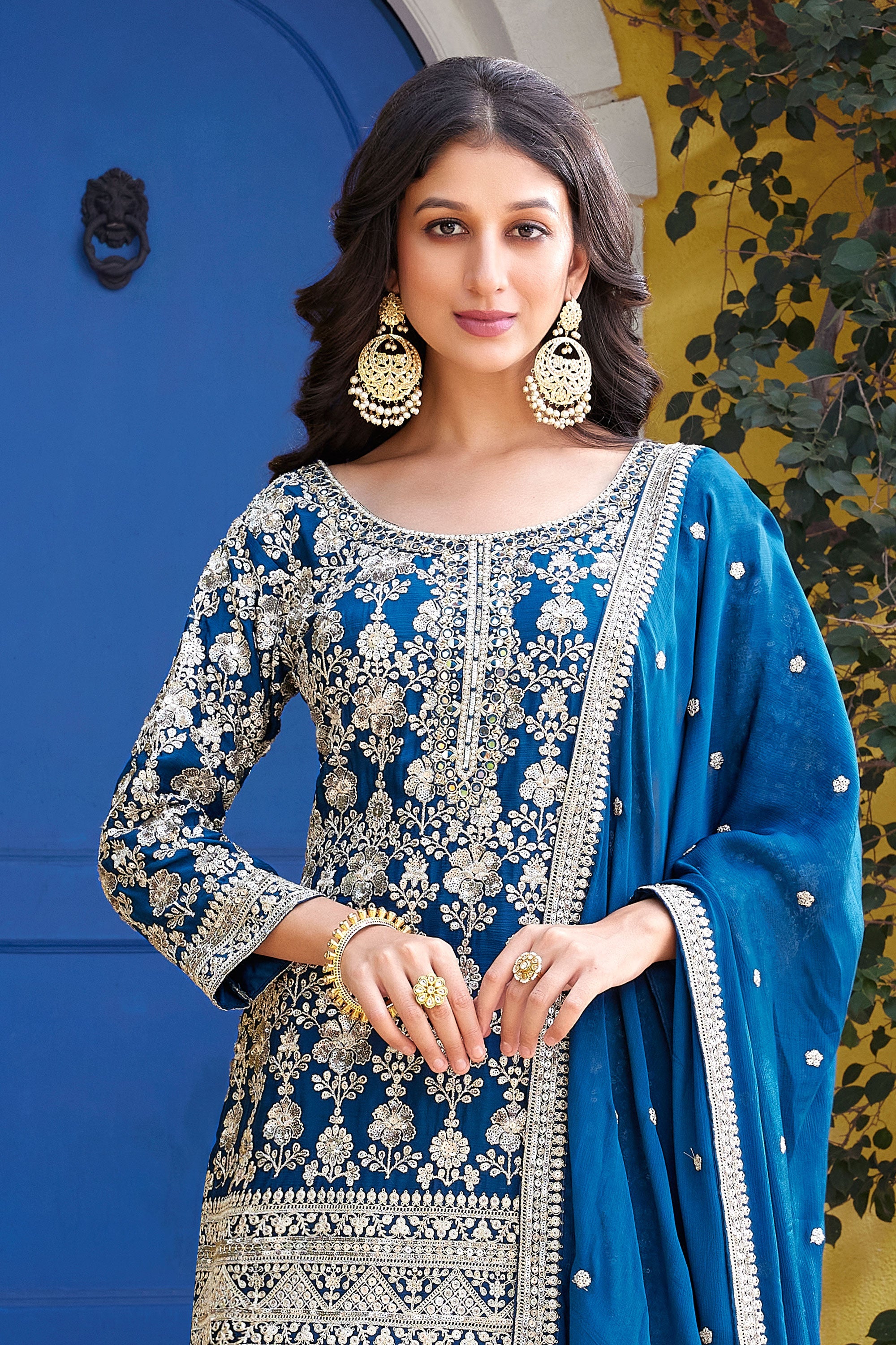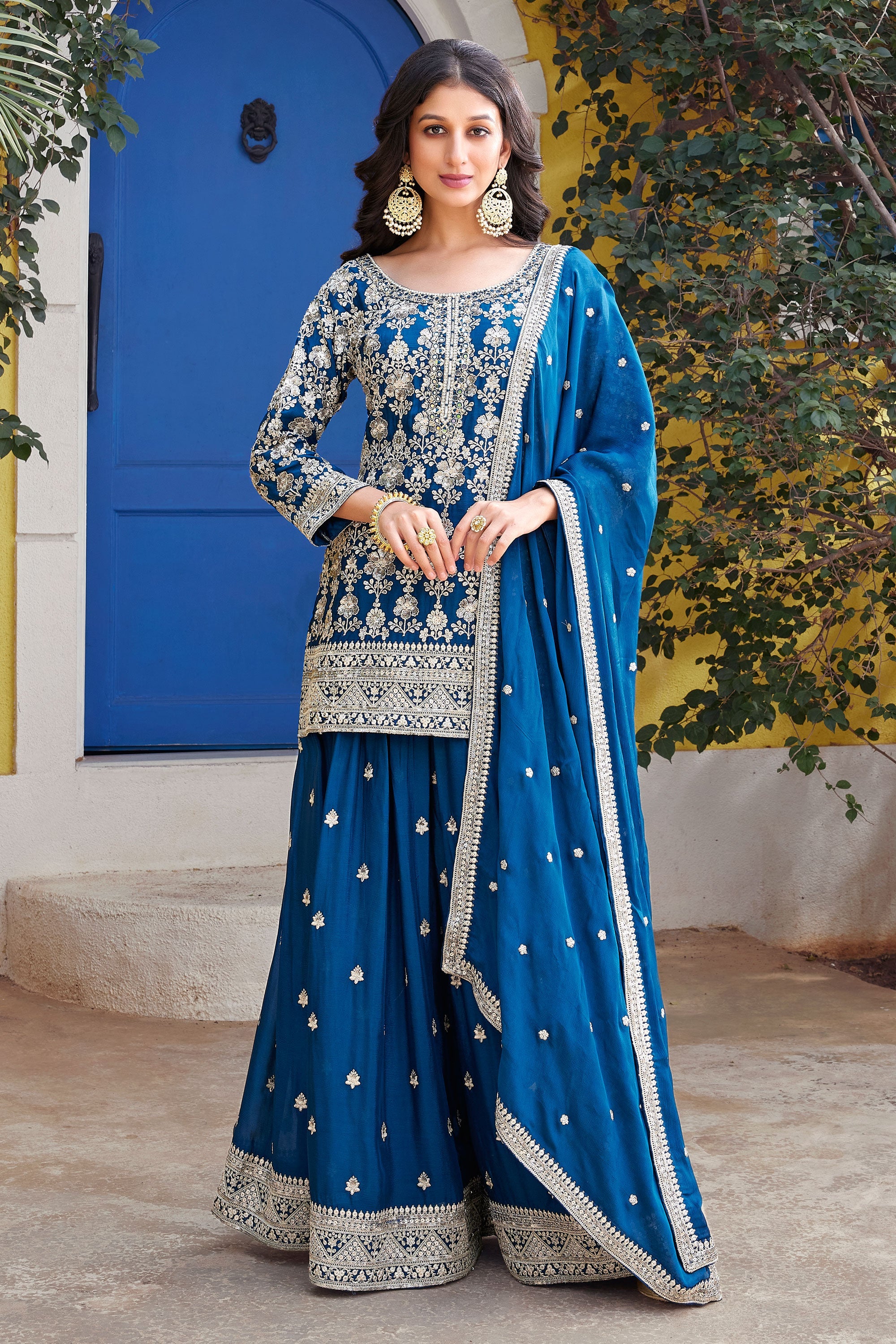 Discover elegance with our Blue Georgette Vanaat Palazzo Set With Long Top. Made from premium georgette, this set includes a comfortable palazzo and a chic long top, perfect for both casual outings and special occasions. The soft, flowy fabric ensures you stay cool and stylish throughout the day. This set features a modern design with traditional elements, offering a versatile outfit for various events. Available in multiple sizes, it's designed to flatter different body types while providing maximum comfort. Embrace sophistication and make a statement with this must-have addition to your wardrobe.
