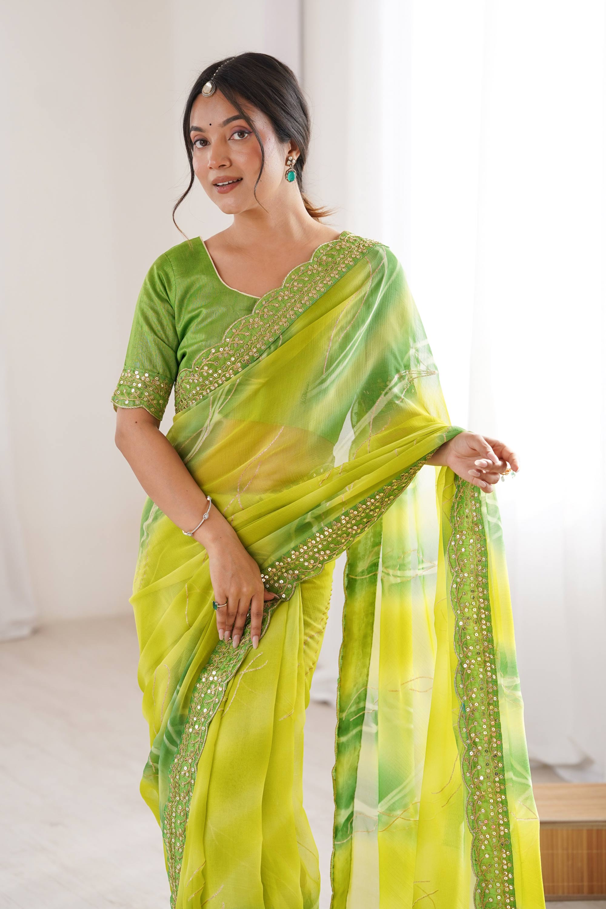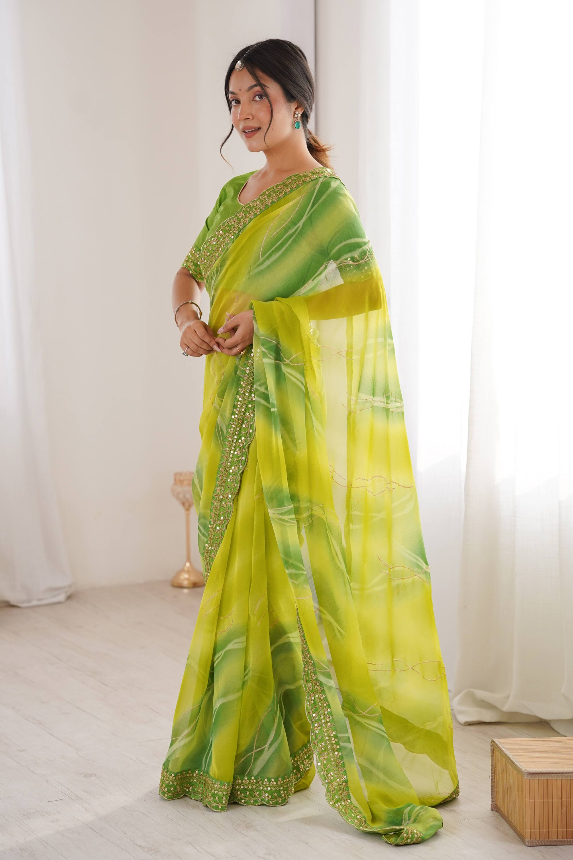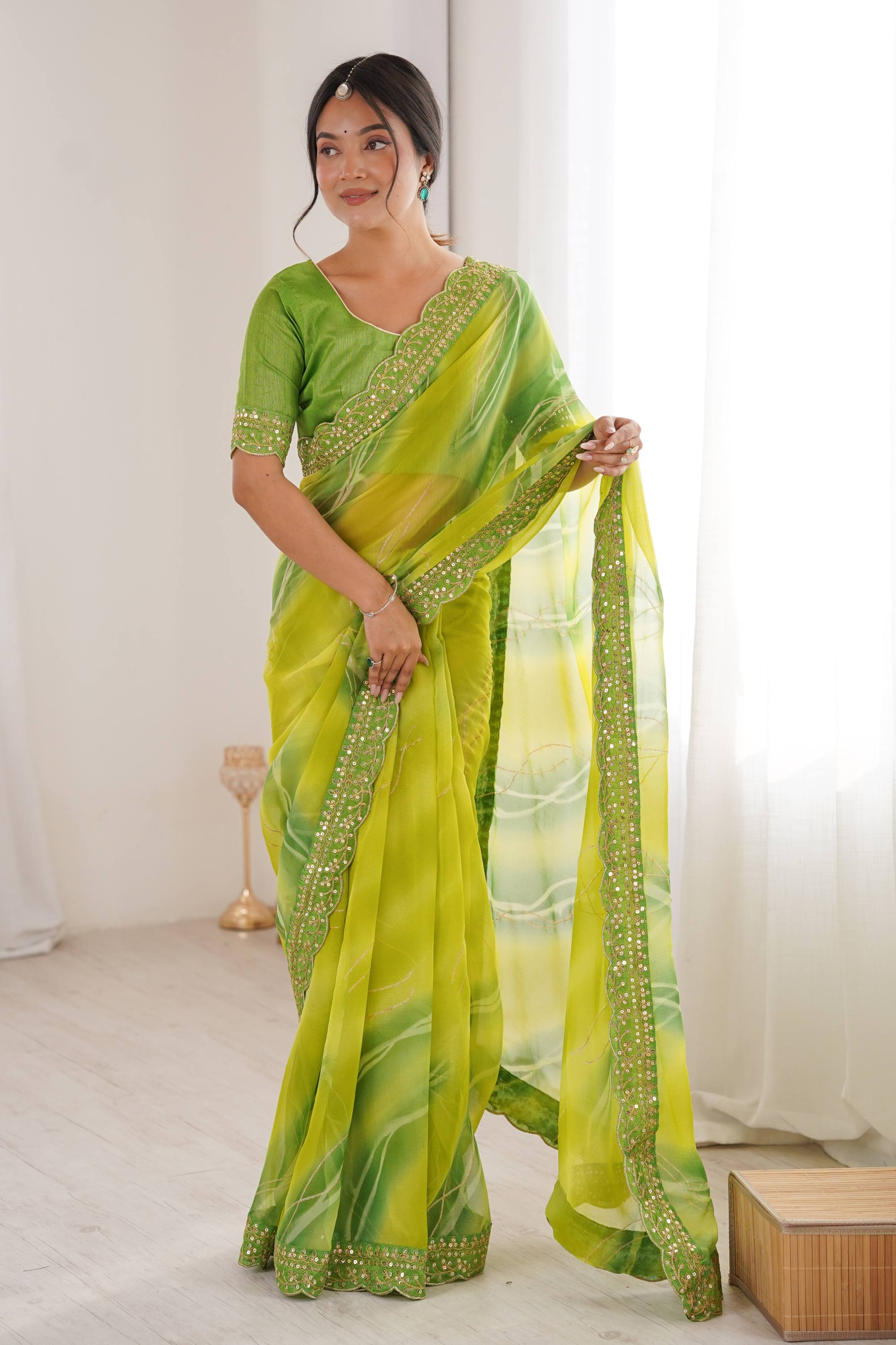 This graceful Party Wear Saree features premium Georgette Chiffon fabric that flows effortlessly and ensures all-day comfort. Adorned with tasteful border detailing, it brings a classy and festive look. The matching Banglori blouse fabric completes the ensemble, while the rich color makes it suitable for party wear, festive celebrations, and special occasions. Note: Minor color differences may be noticed due to digital photography.