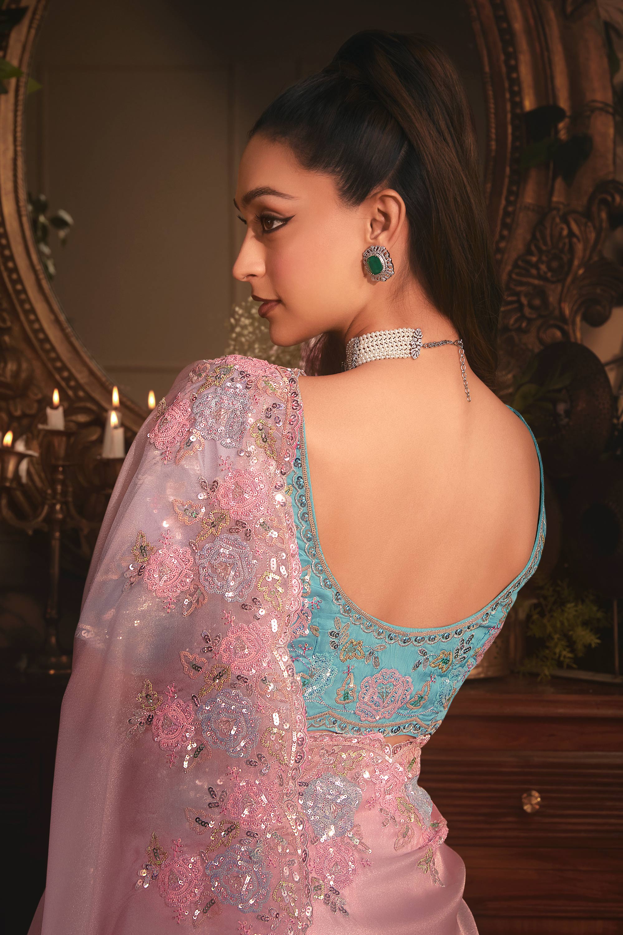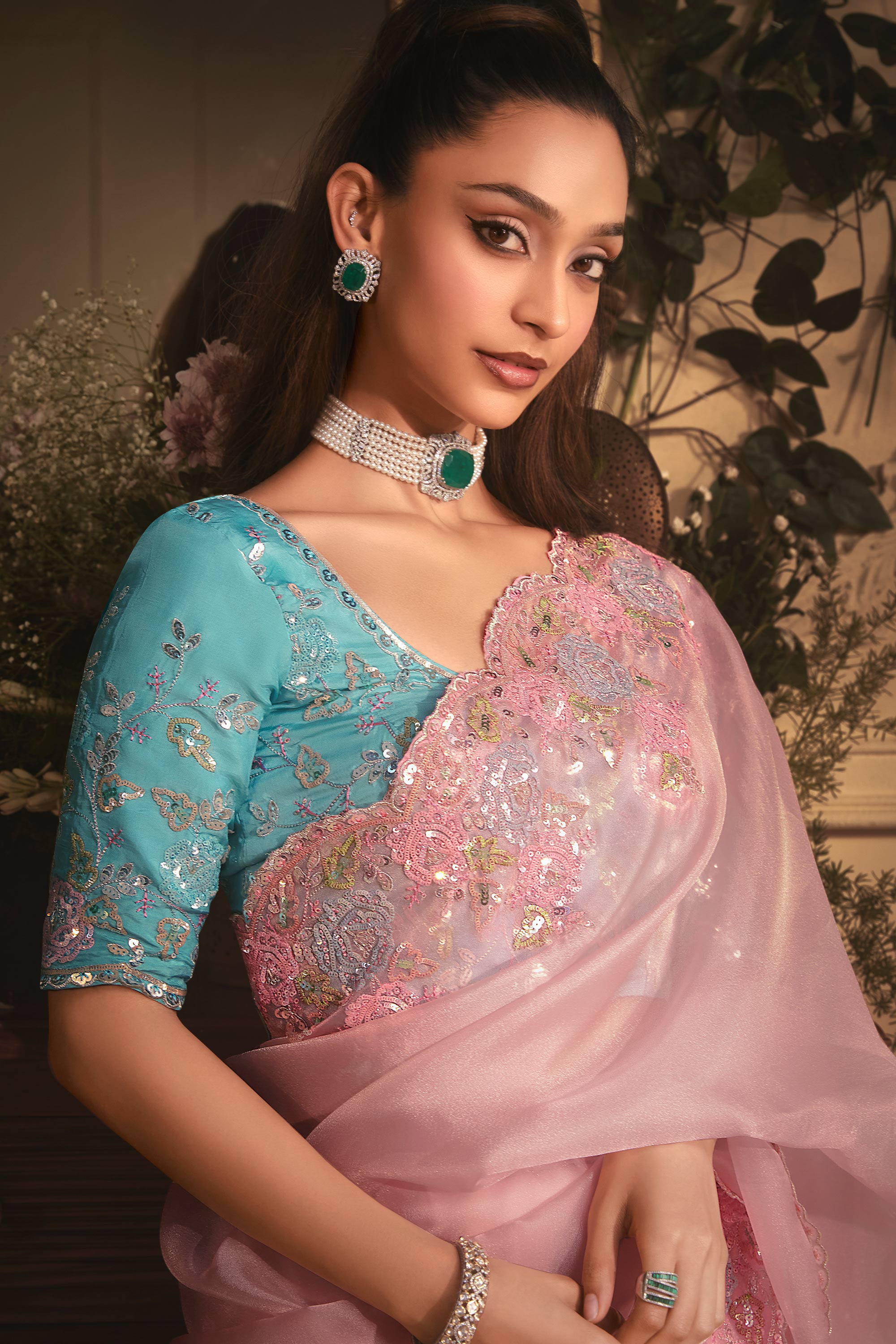 Border Work On Pink Color Sober Saree In Organza Fabric
