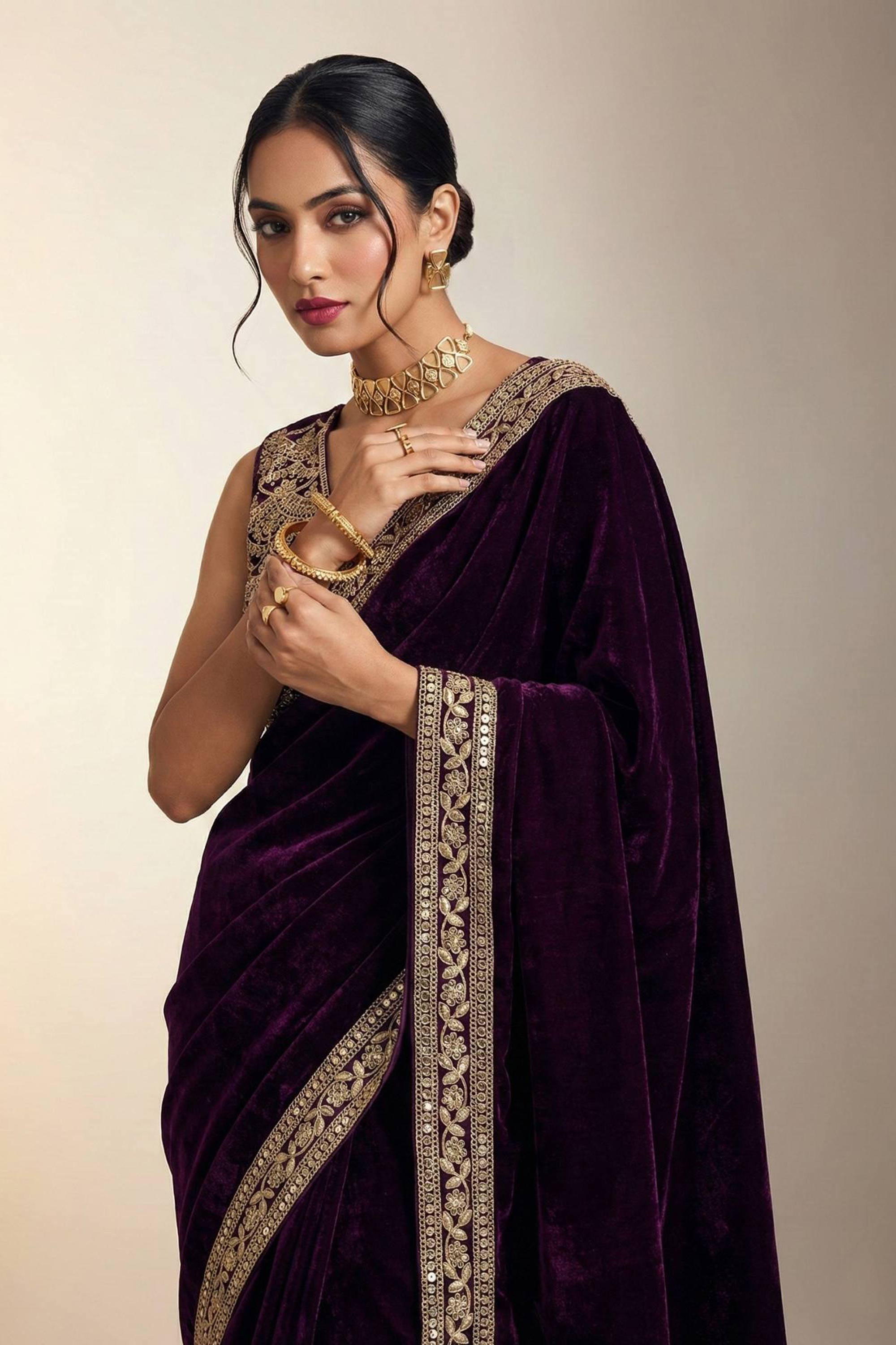 Border Work Viscose Velvet Wine Saree For Party Wear