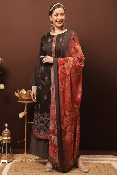 Brown Art Silk Embroidered Function Wear Palazzo Suit