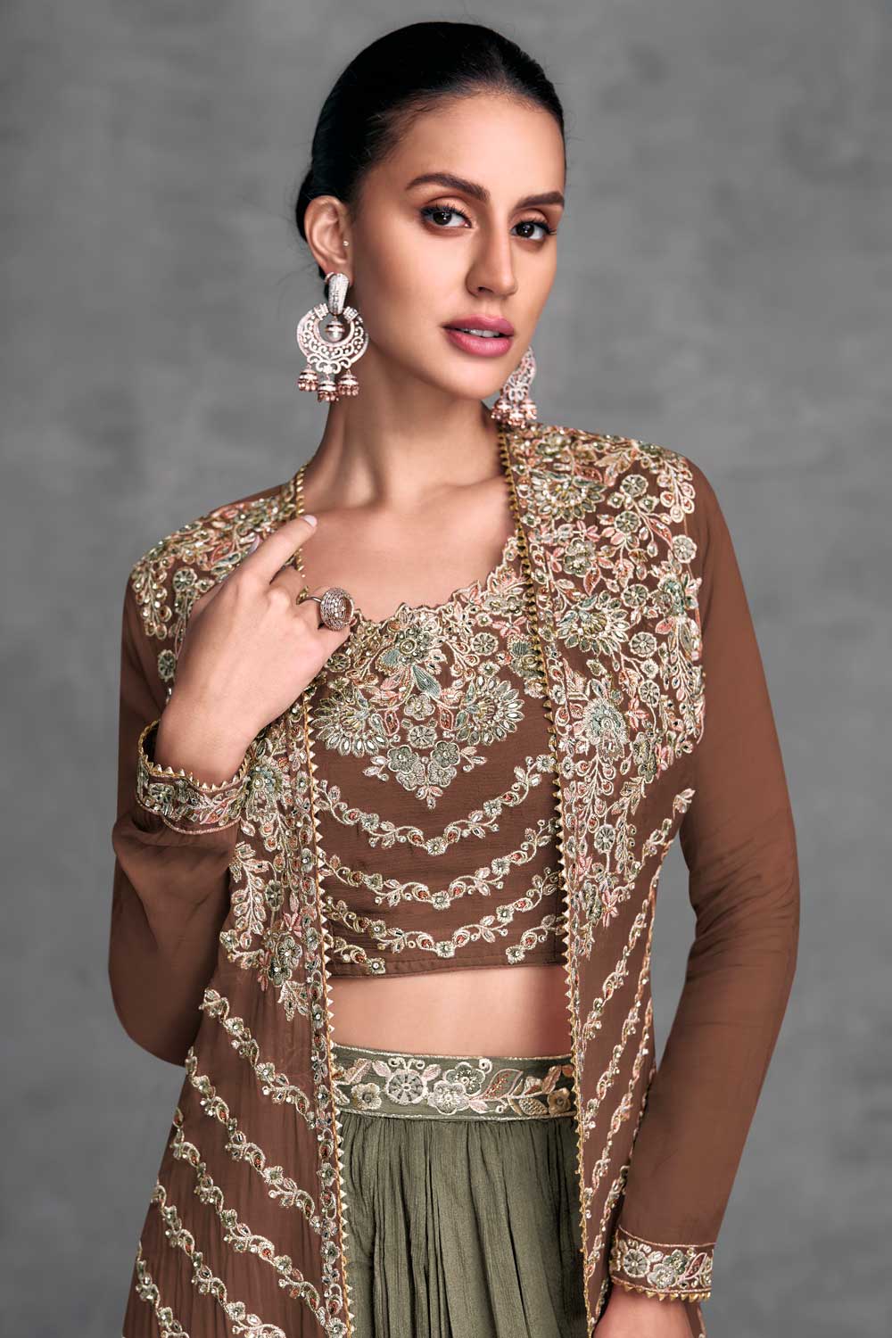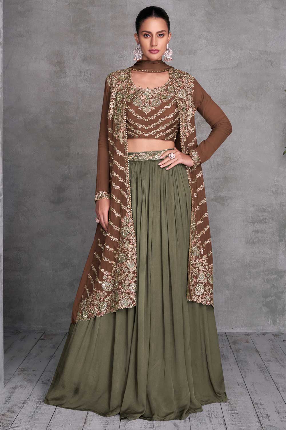 Brown Color Chinon Fabric Stunning Readymade Lehenga