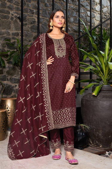 Brown Color Function Wear Embroidered Designer Long Straight Cut Suit In Fancy Fabric