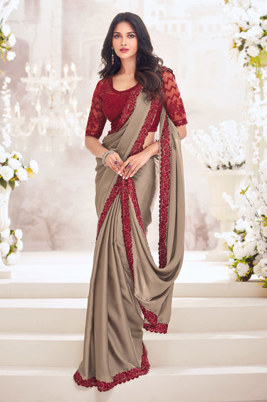 Brown Color Satin Fabric Party Wear Embroidered Saree