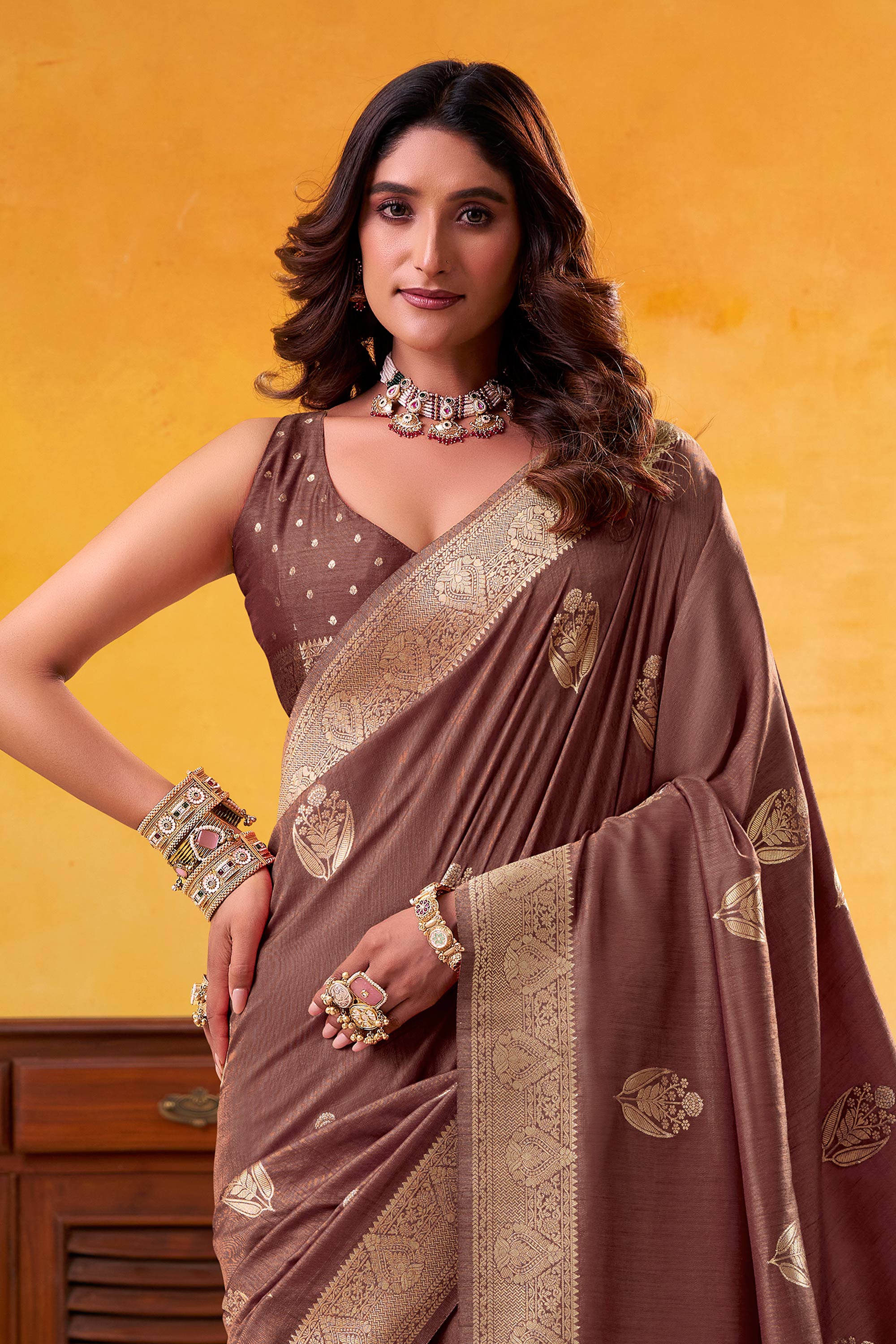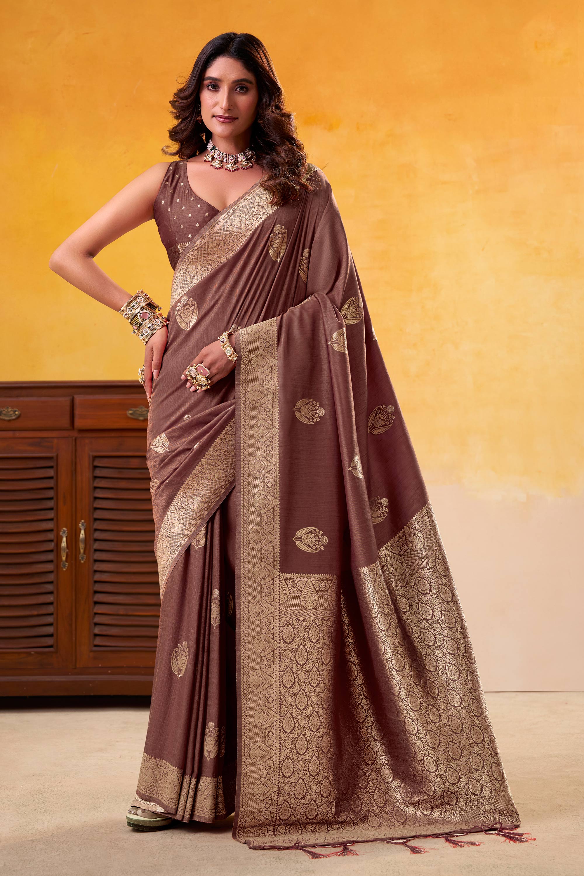Brown Function Wear Art Silk Weaving Work Saree