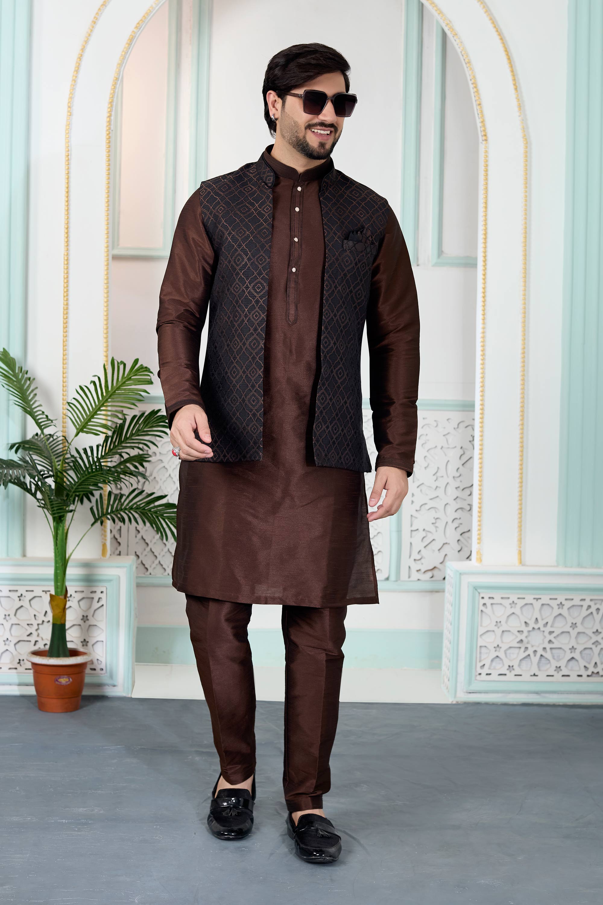Step into festive sophistication with this Mens Kurta and Aligadhi Pant with Jacket Set, designed to reflect classic ethnic charm. Featuring a jacquard kurta, art Banarasi silk Aligadhi pant, and a comfortable faux satinlined jacket, this ensemble is ideal for weddings and special occasions, and slight color variations may occur due to digital photography.