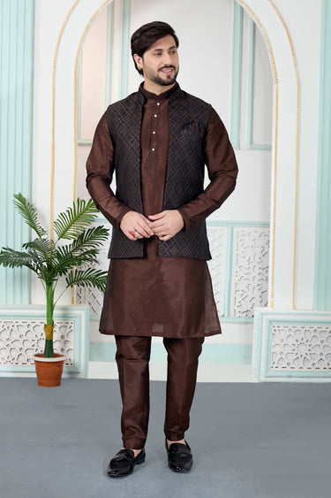 Brown Wedding Wear Jacquard Fabric Readymade Kurta And Aligadhi Pant For Men