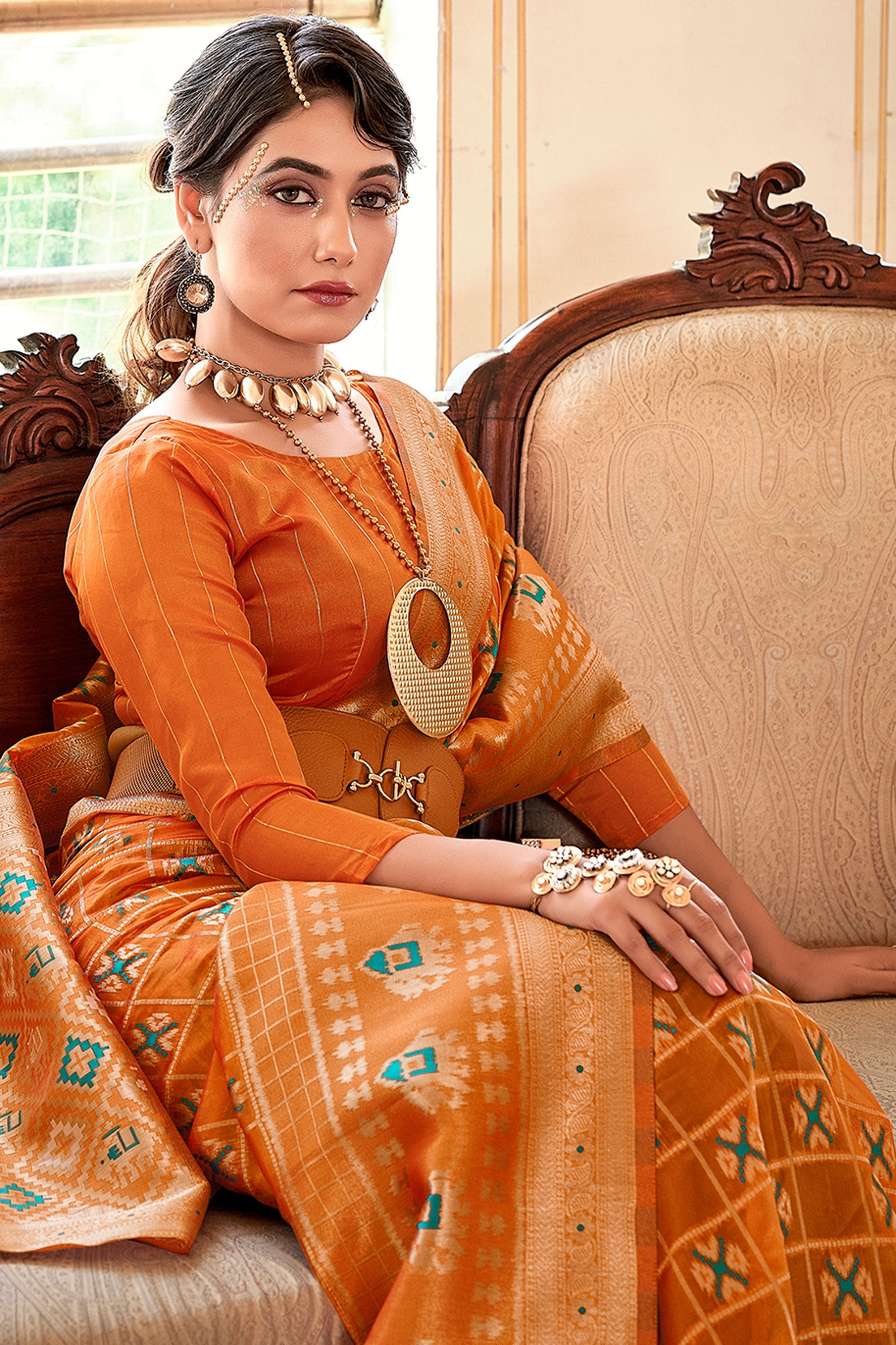 Butterfly Weaving Work Organza Fabric Saree In Orange Color