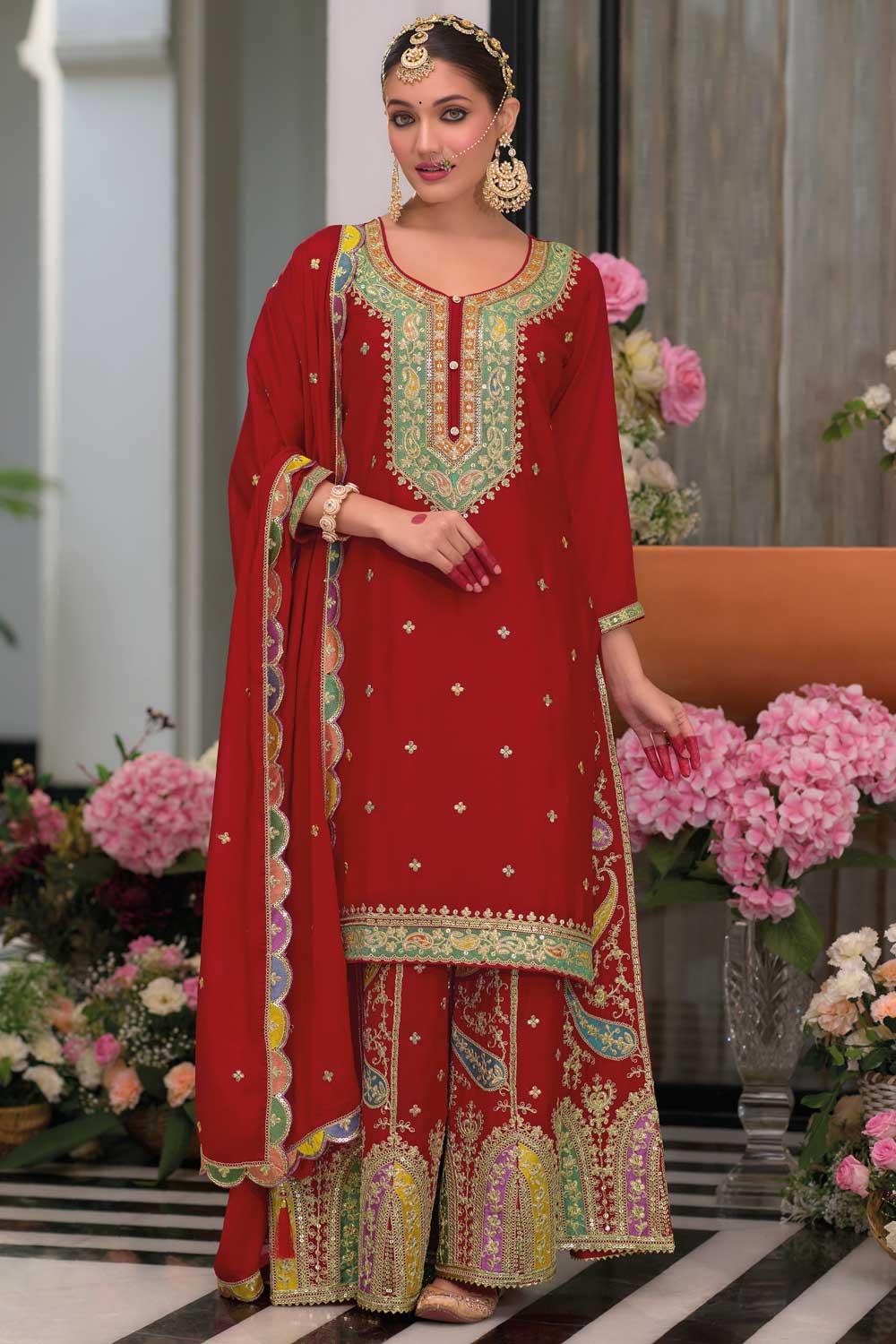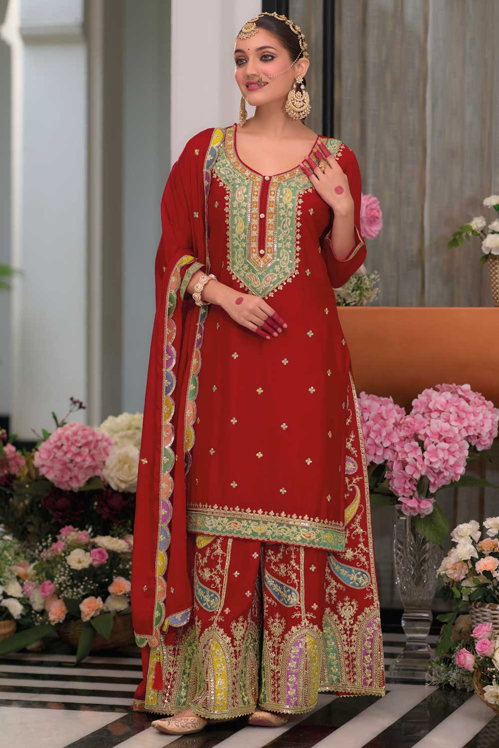 Celebrate special moments in style with this exquisite Palazzo Suit, perfect for Karva Chauth or any grand function. Crafted from luxurious Heavy Chinon fabric, the suit offers a sophisticated look from head to toe. The intricately detailed embroidery work adds an elegant charm, making you stand out in every crowd. Available in sizes 38 to 44, designed to fit gracefully., Slight color variations may occur due to different lighting conditions.