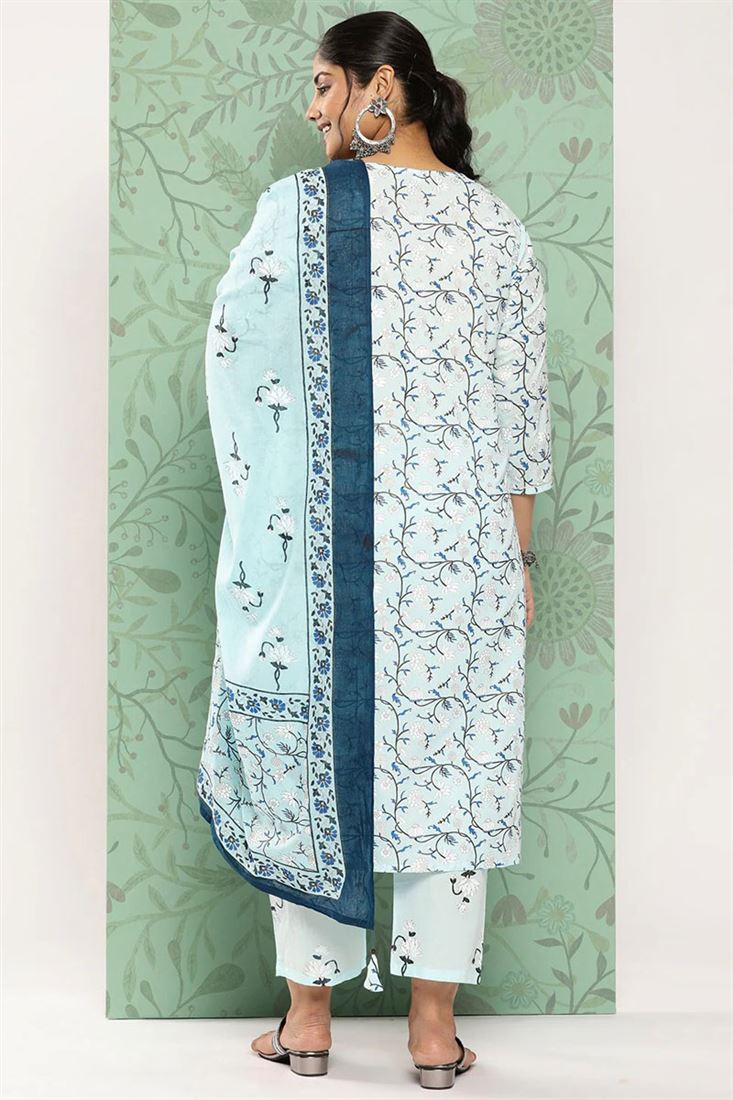Casual Style Cotton White Color Plus Size Top Bottom Dupatta Set with Printed Work