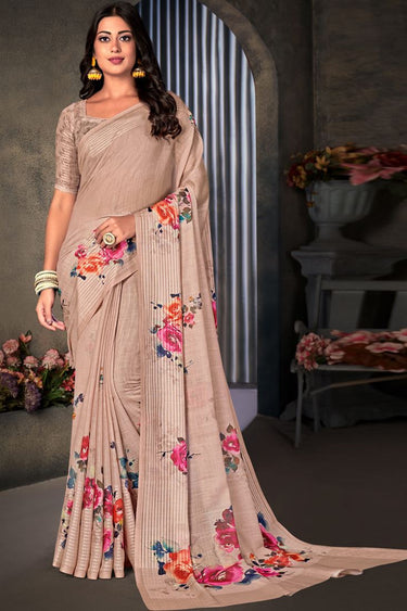 Casual Wear Peach Color Cotton Linen Fabric Regal Digital Printed Work Saree