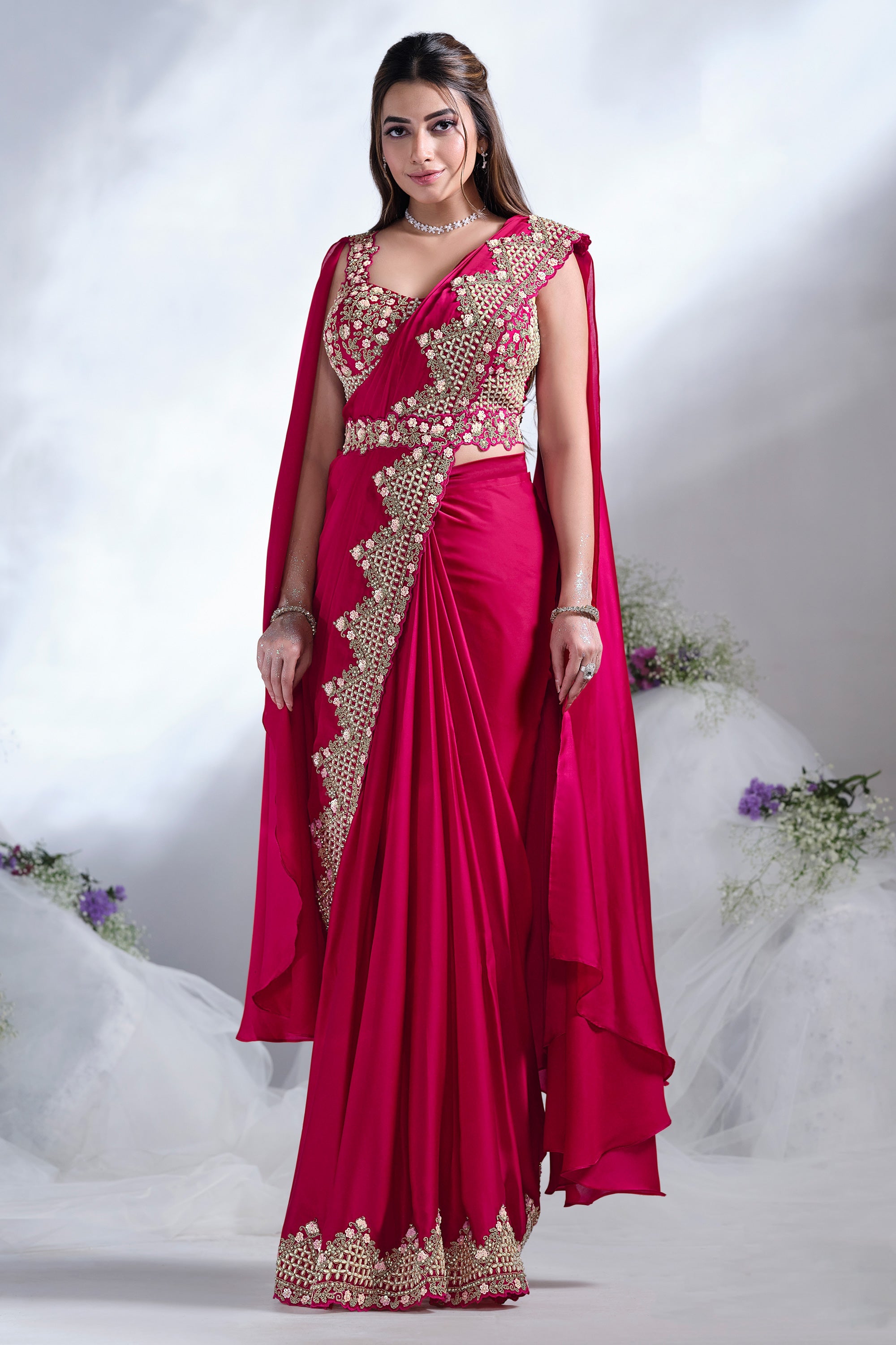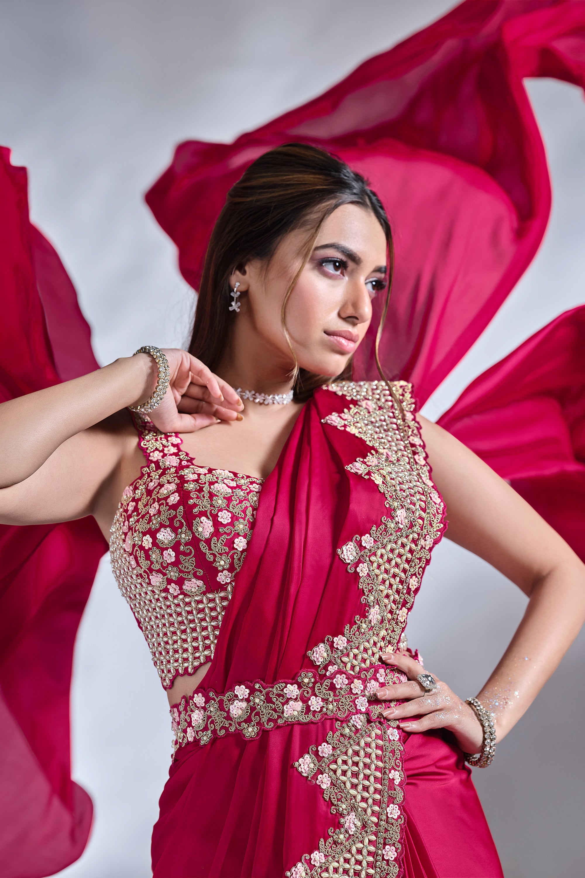 Champagne Red Ombre Ready To Wear Sequins Work Saree
