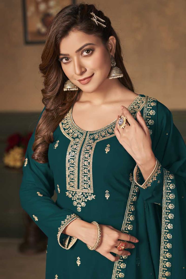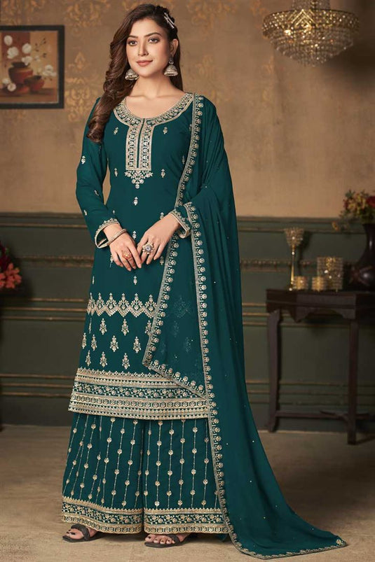 Charismatic Teal Color Festival Wear Palazzo Suit With Embroidered Work