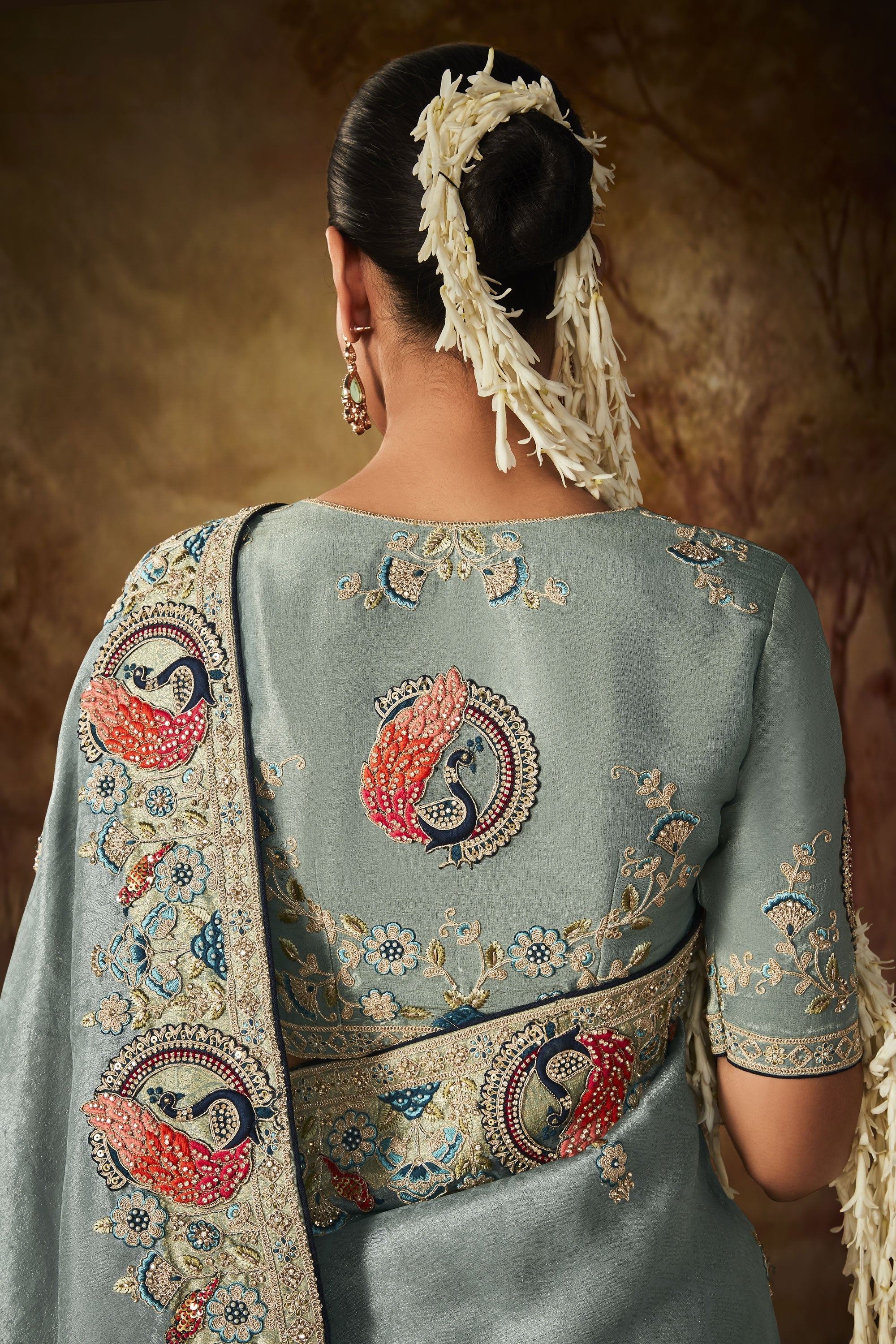 Charm Light Cyan Embroidery Work Banarasi Kanjivaram Saree