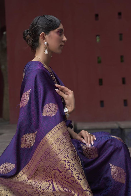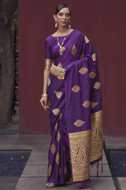 Charming Purple Color Weaving Designs On Satin Silk Saree